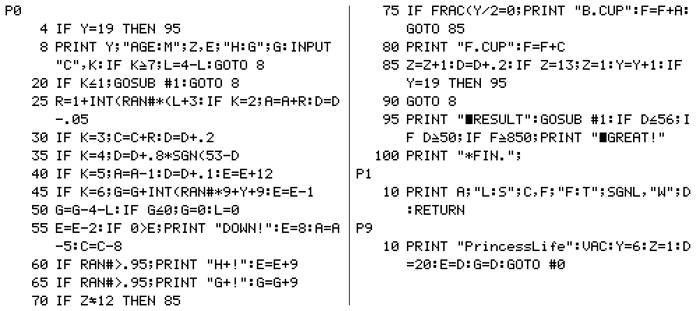 かつて544ステップのシミュレーションゲームは多数作られてきました。しかし使用可能容量の少なさから、それらと同様、やはりINPUT文をメインに持って来ざるを得ませんでした。操作性を気にするおいらのゲームでは珍しい形といえるでしょう。