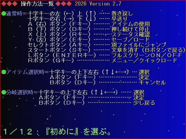 ・3年間気づかなかった、「暗号化ファイル実行時にセーブ・ロードすると人物表示がおかしくなるバグ」を解消。クイックセーブ機能の導入。また、いつでもタイトル画面に戻れるように。
