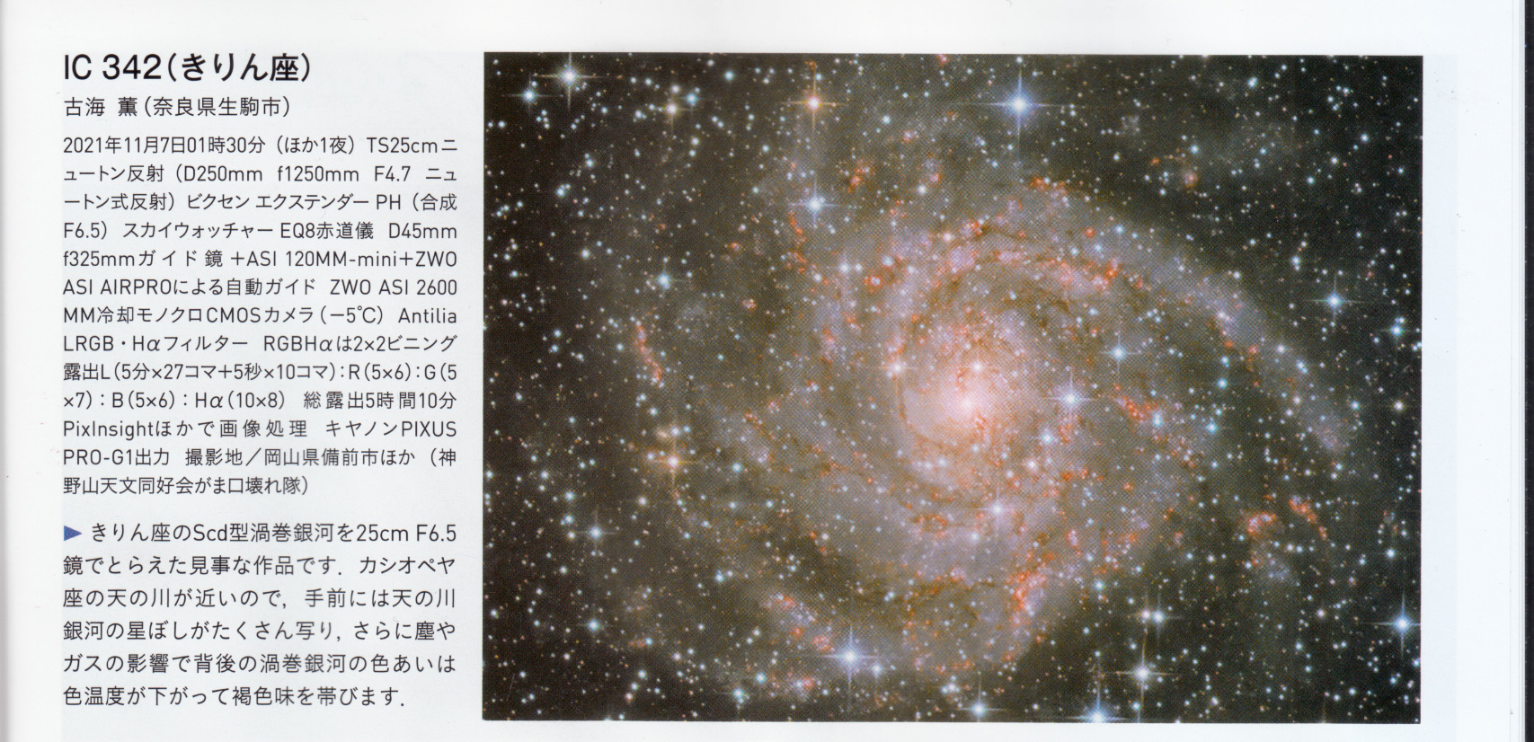 IC342はNikonD810Aで撮影したことがあるのですが、淡い対象なので階調が不足しうまく表現できなかった記憶があります。冷却CMOSカメラは階調豊富で、さすがな感じです。