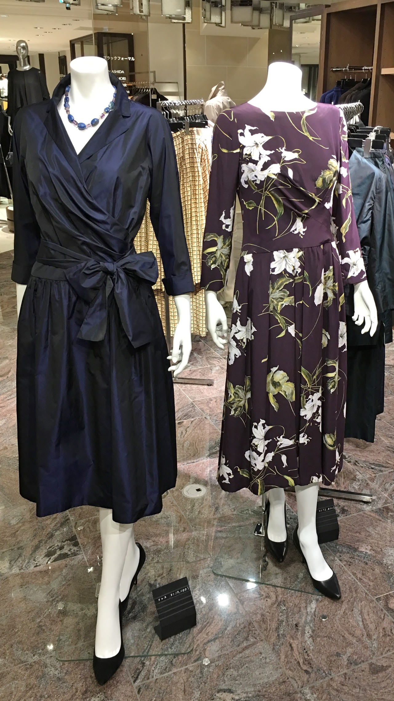 右 ダークフローラルドレス ¥160,000 + tax. ( パープル系 38・40号展開 )