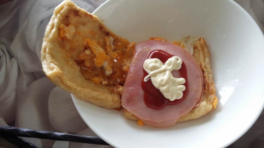 スクランブルエッグとハムをのせます。
