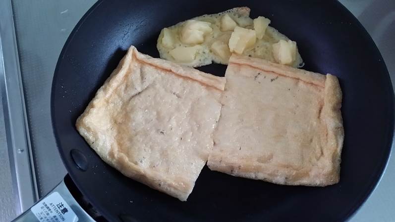 油揚げとチーズを同時にフライパンで焼きます。