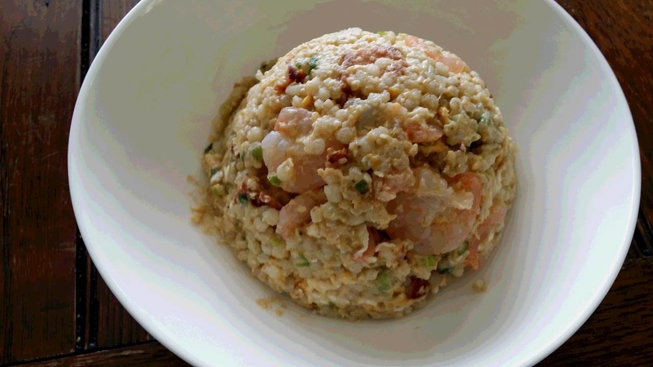 エビと焼き豚と青ネギを混ぜて、炒めて完成!