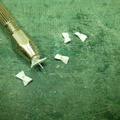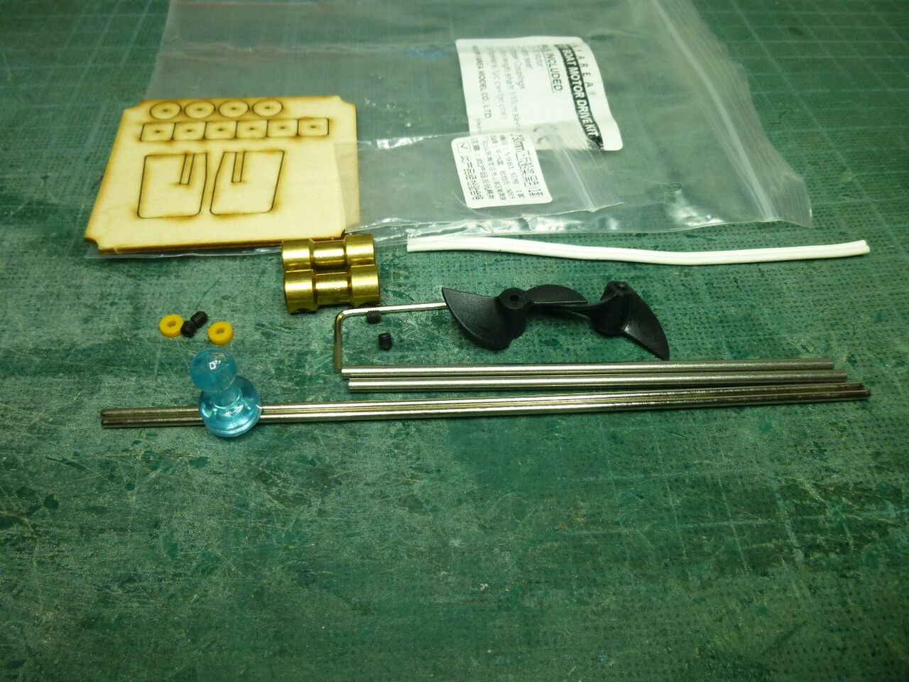 こちらはキットに付属していたジョイントです。 モーター軸とスクリューシャフトをつなぎますが見ての通り真ちゅう棒の塊なので軸同士が一直線でないとズレがそのままロスになります。取り付け精度が求められますが1軸なら何とかなりますが2軸同時にとなると難しいので写真の下に映っているユニバーサルジョイントに置き換えます。