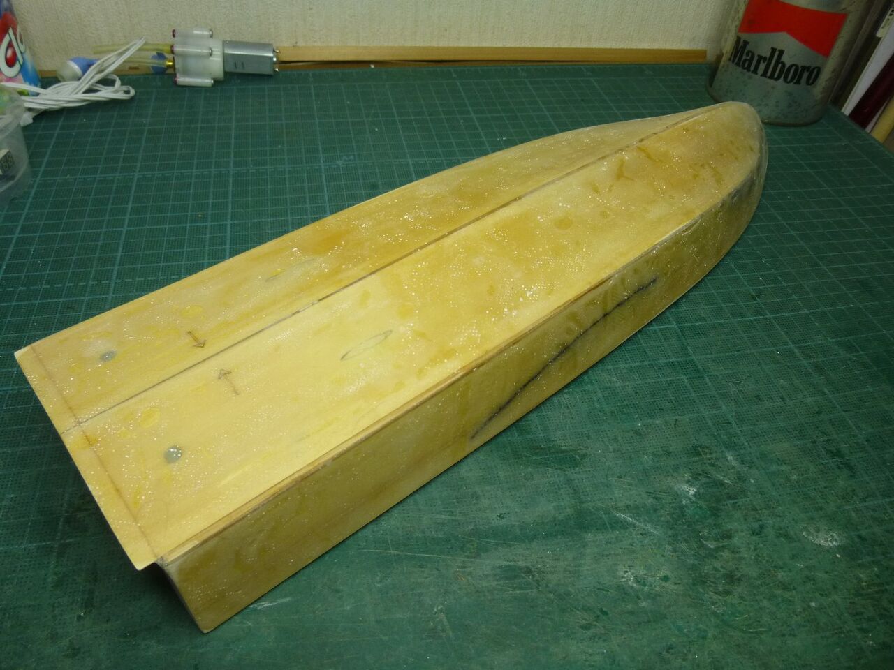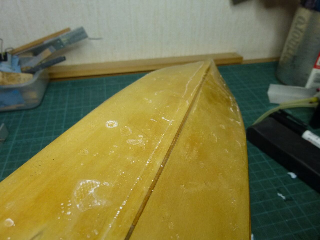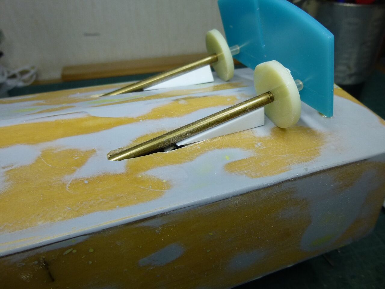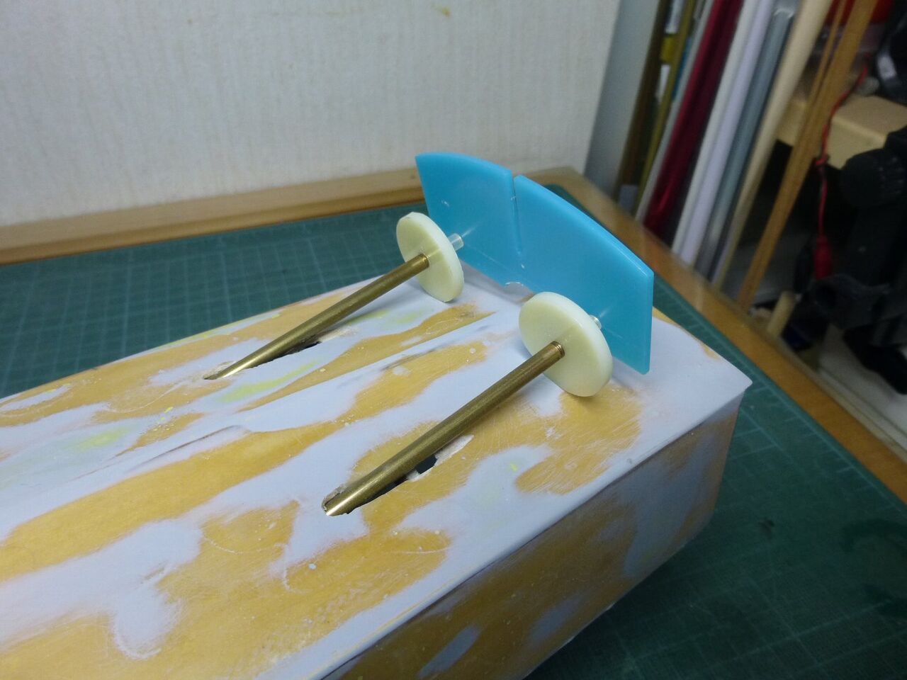 スタンチューブの位置が出たところでスケグをプラ板から切り出しました。キットではベニヤを使うように指示されてますが常に水中に触れる部位は極力防水性能を高めるために材料を置き換えます。