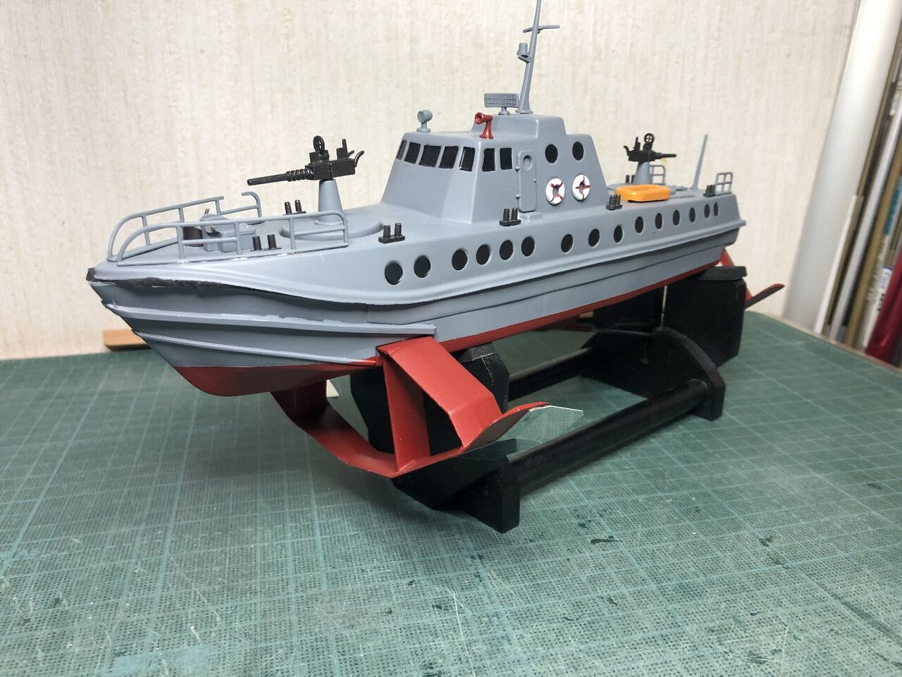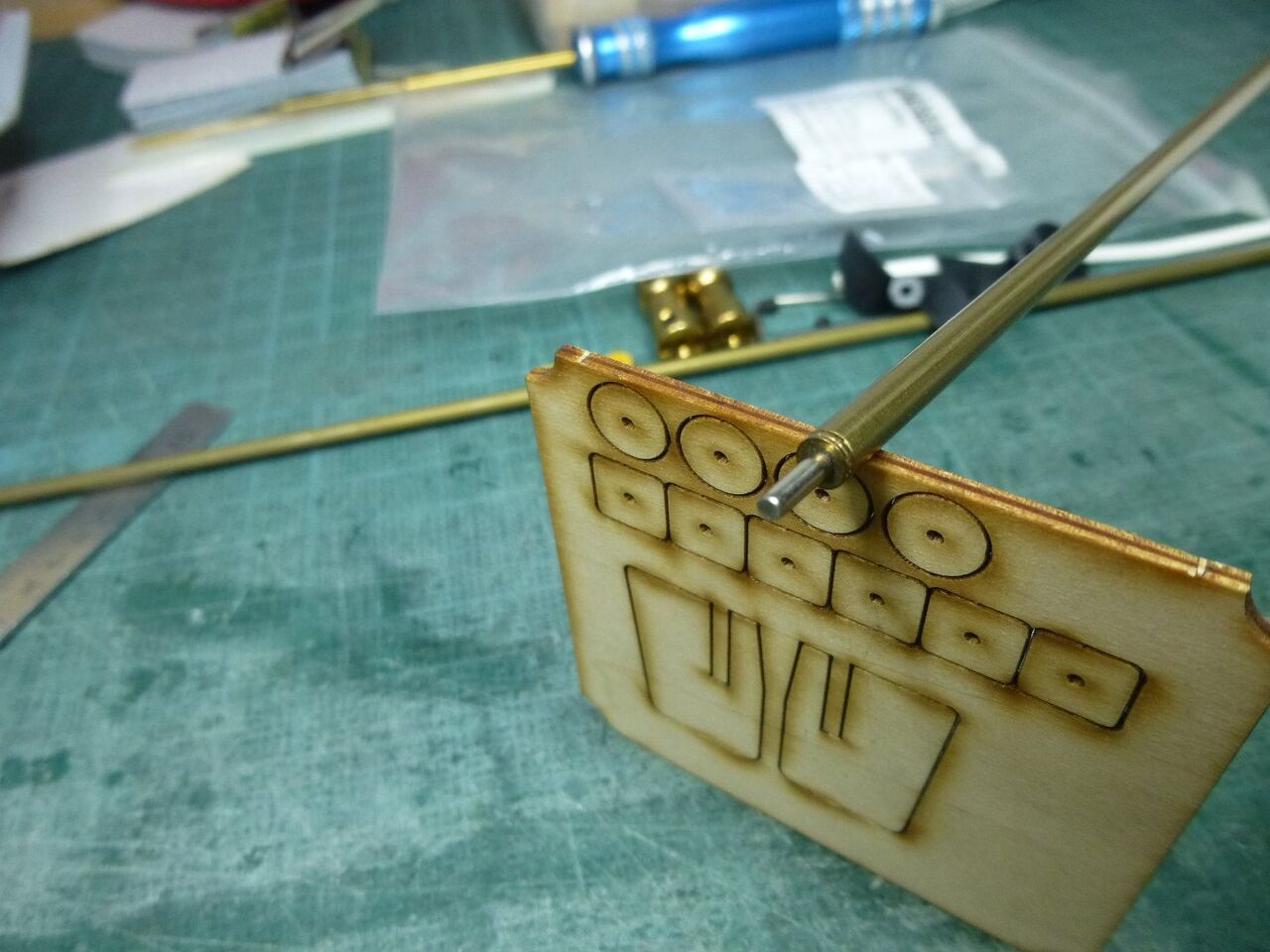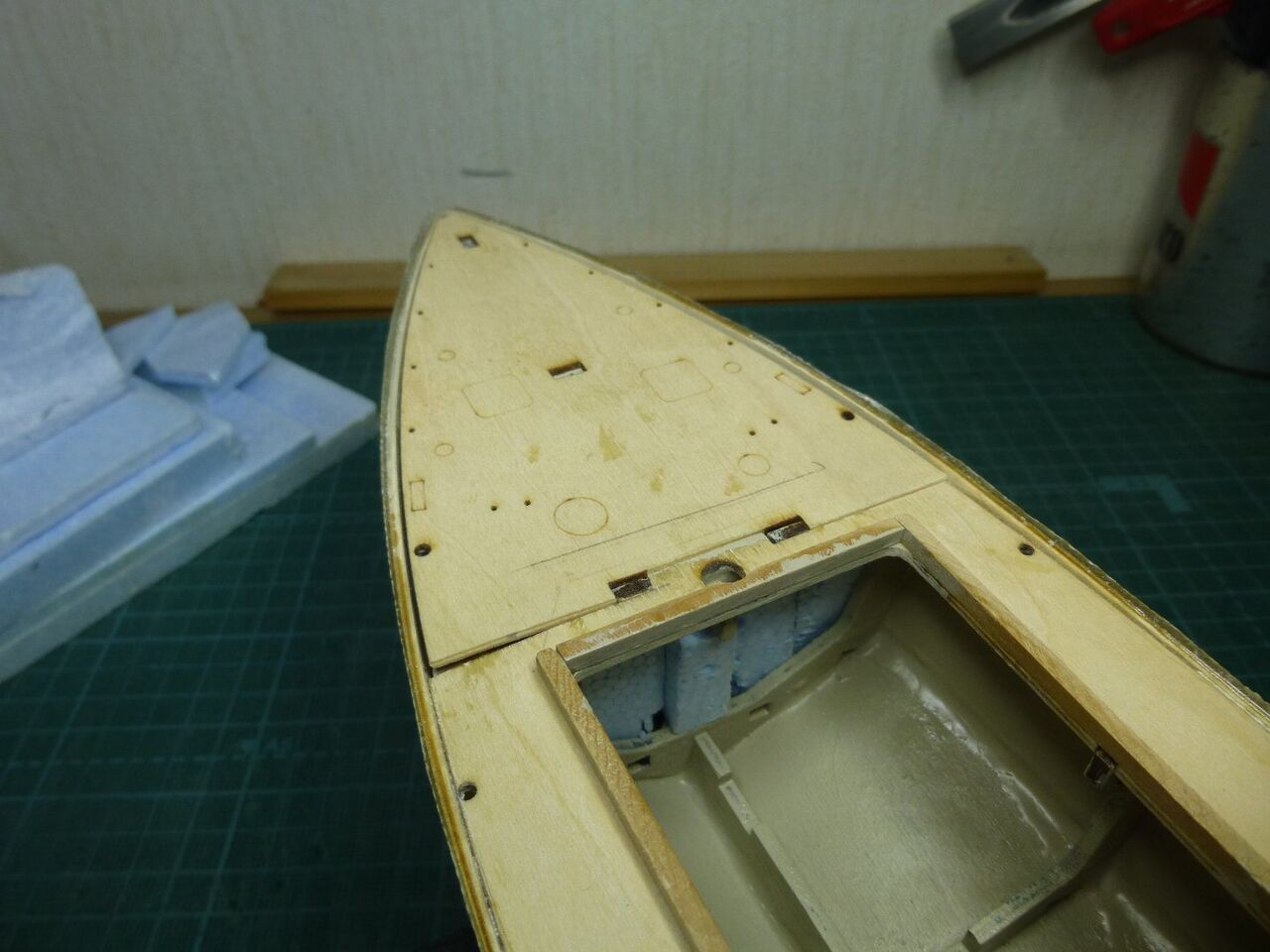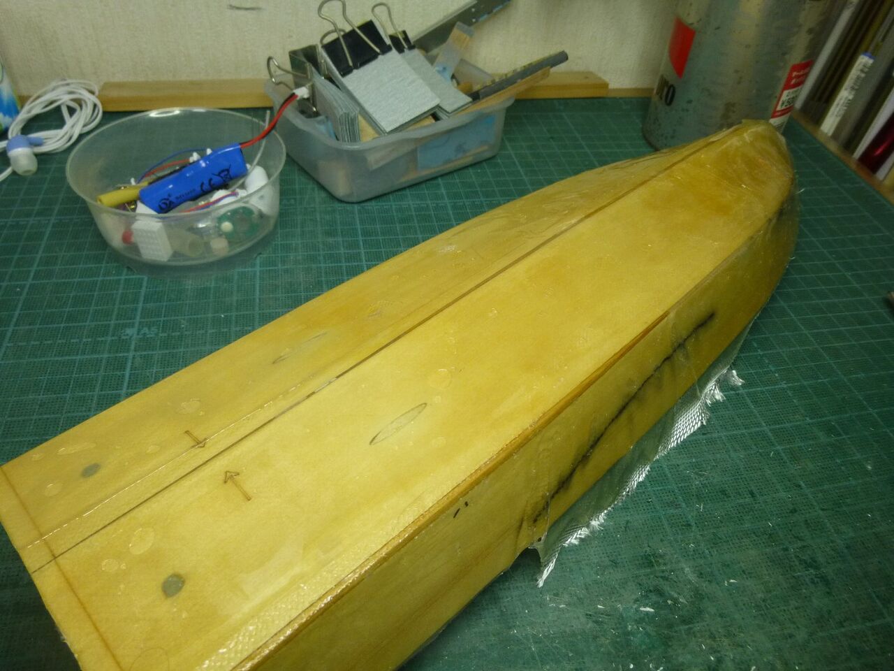 スタンチューブの位置が出たところでスケグをプラ板から切り出しました。キットではベニヤを使うように指示されてますが常に水中に触れる部位は極力防水性能を高めるために材料を置き換えます。