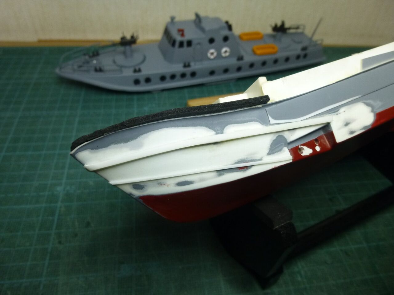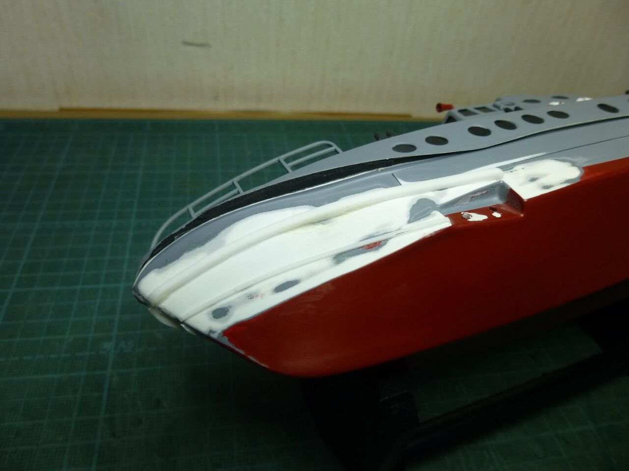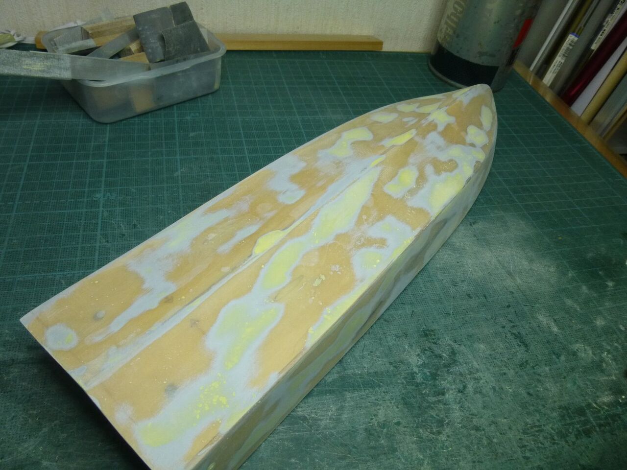"\( ̄^ ̄)゛ハイ!! スッ飛んじゃってますがエポキシにタルクを混ぜたパテで隙間を埋めて削り出してサフ吹きました。 1回目のパテ埋めなんでまだまだ穴が残ってますね(つд⊂)ェ〜ン さらにパテ埋めしてキレイにならしています。これでスクリュー周りはメドがついたのでお次はラダー関係ですね