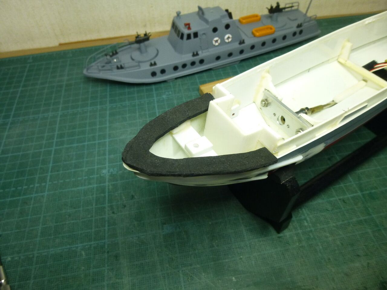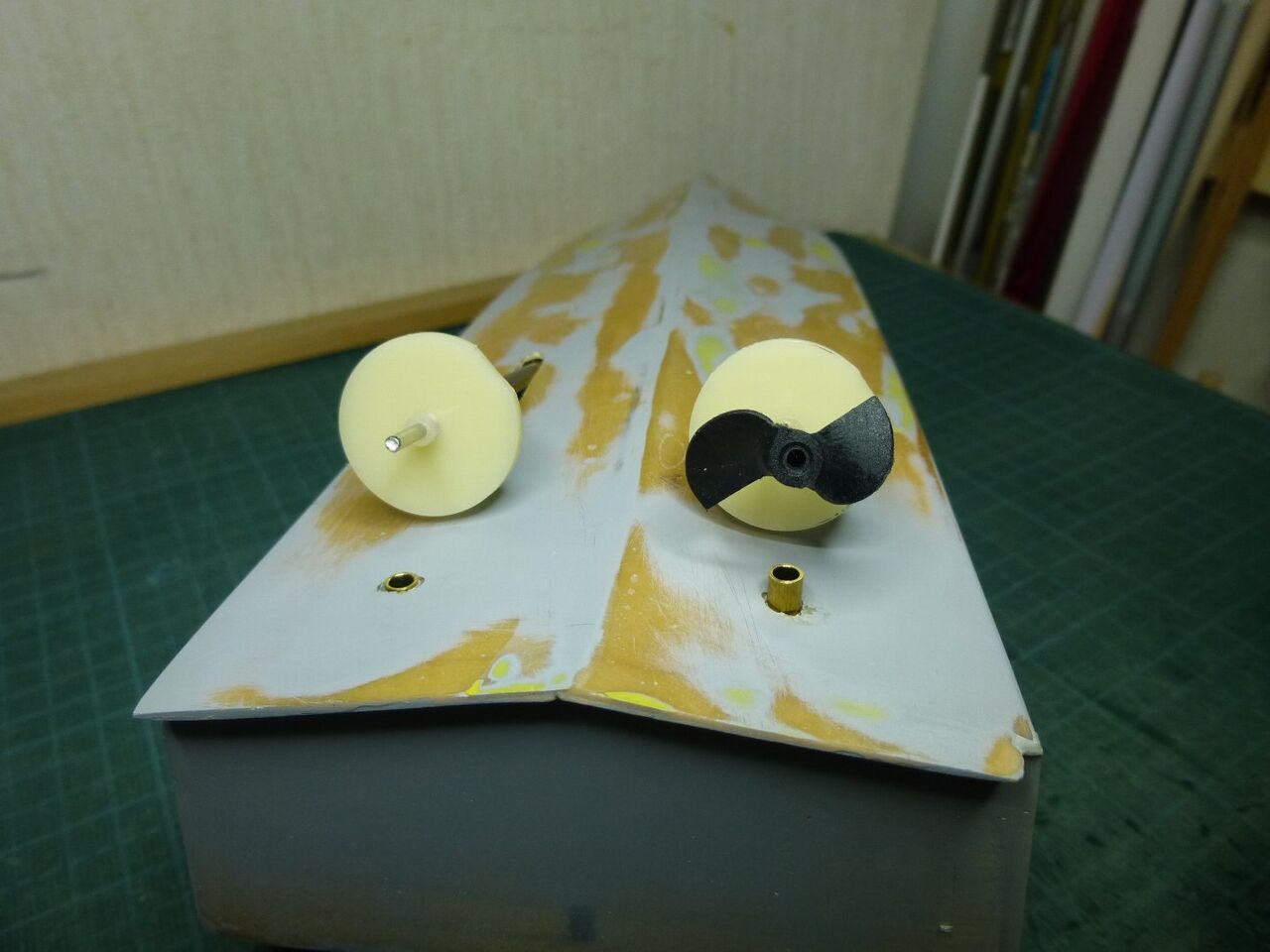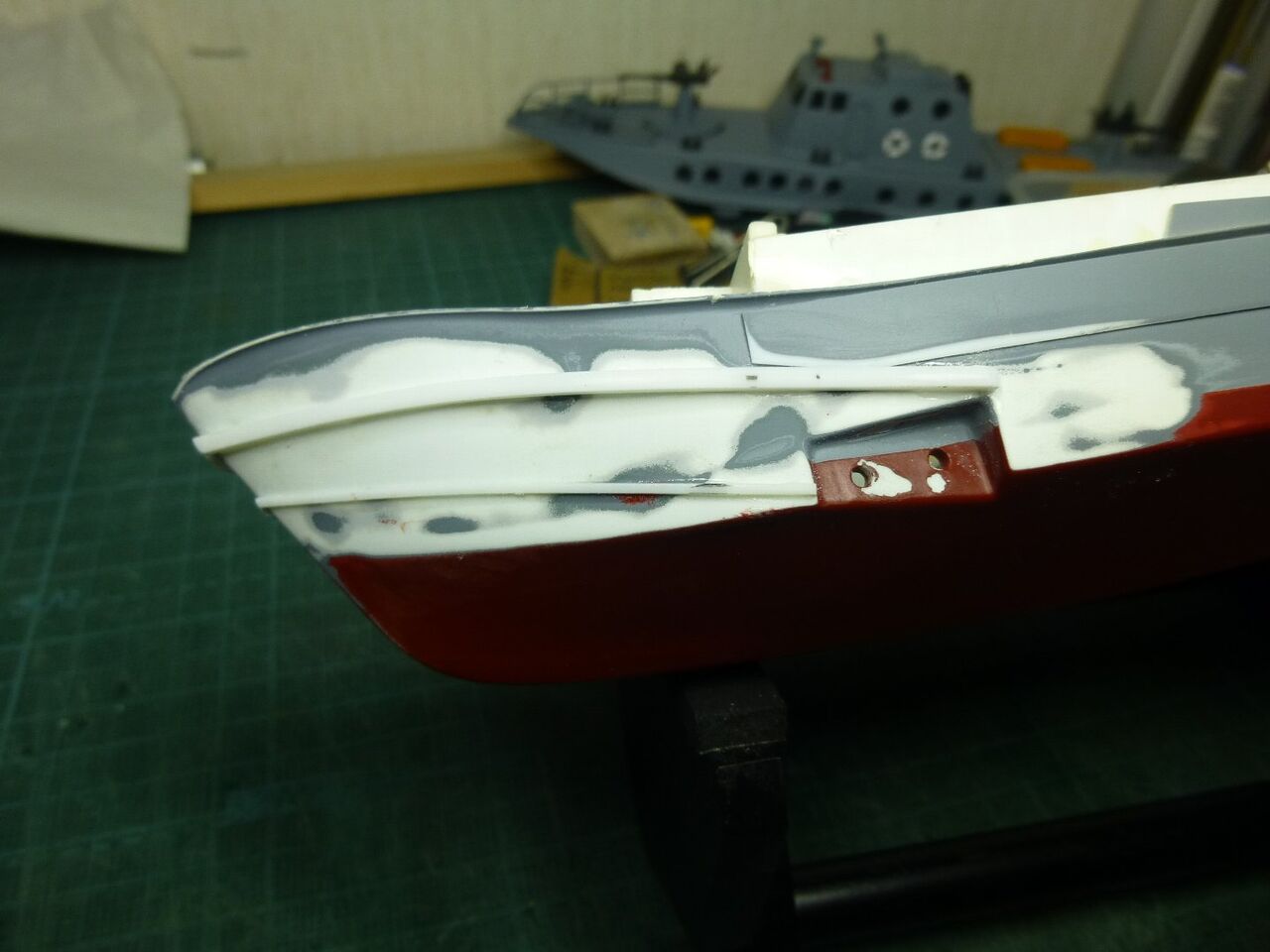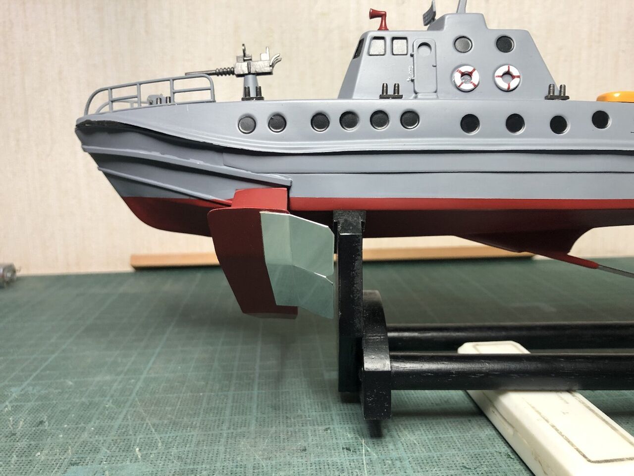 "\( ̄^ ̄)゛ハイ!! スッ飛んじゃってますがエポキシにタルクを混ぜたパテで隙間を埋めて削り出してサフ吹きました。 1回目のパテ埋めなんでまだまだ穴が残ってますね(つд⊂)ェ〜ン さらにパテ埋めしてキレイにならしています。これでスクリュー周りはメドがついたのでお次はラダー関係ですね