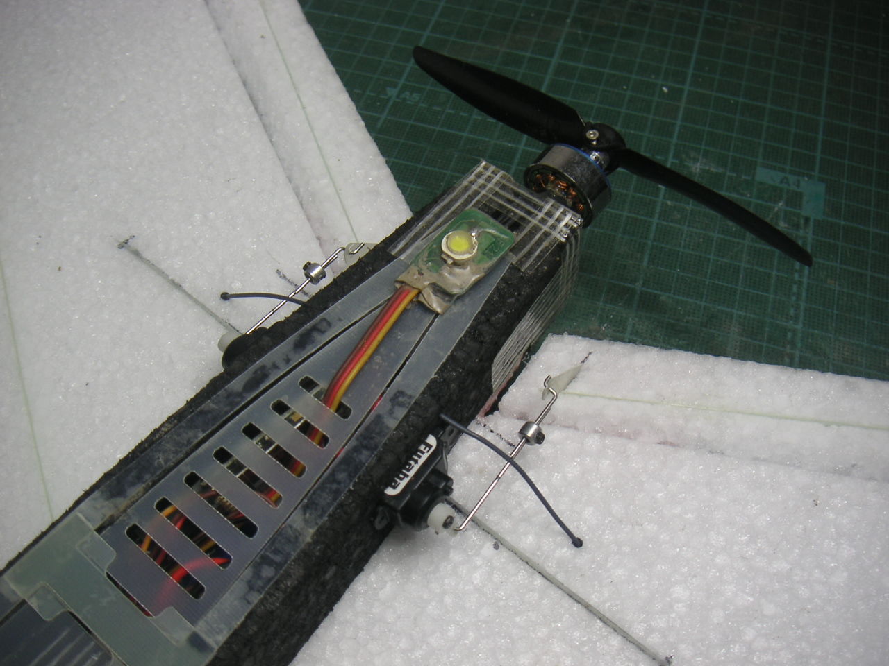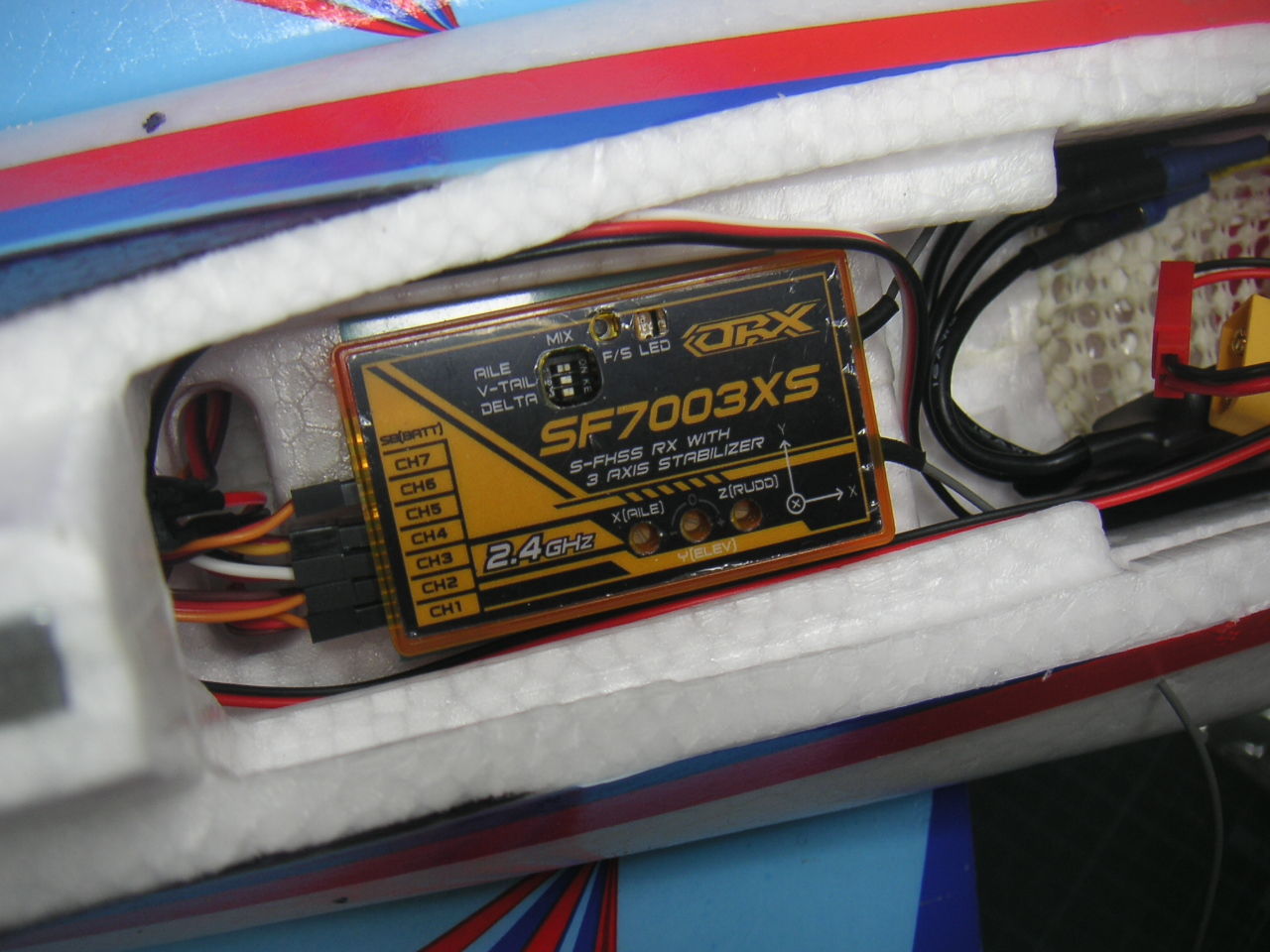 受信機ですが1機目に続き同じジャイロ付きを載せました。1機目墜落の原因となってしまったジャイロですが、とりあえず最初はONせずトリムとバランス取りに集中してからジャイロを使うようにします。(´ヘ`;) う〜ん ゲインは半分ぐらいから始めればいいのかな?