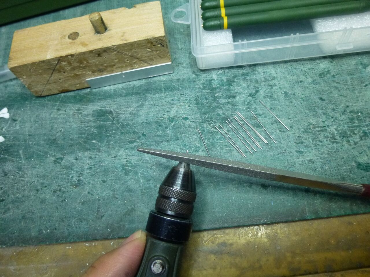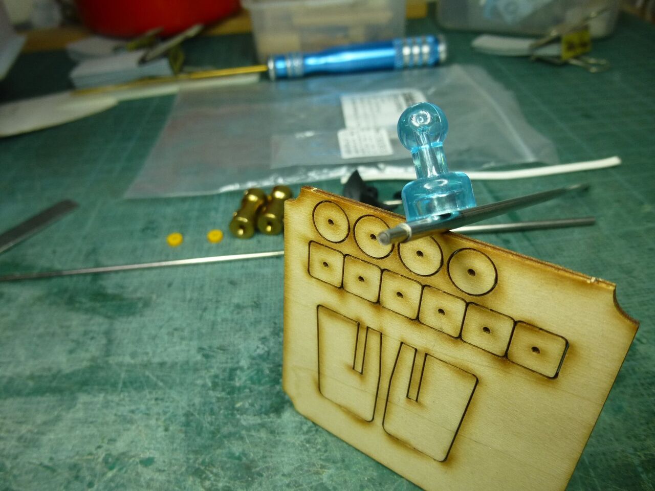 さて巡視艇ですがスタンチューブを固定しないと先には進めませんなのでモーター軸と一直線になるようにスタンチューブを固定して接着する必要があるのでちょっとした治具を準備します。 適当な樹脂板にモーターの穴を転写します。