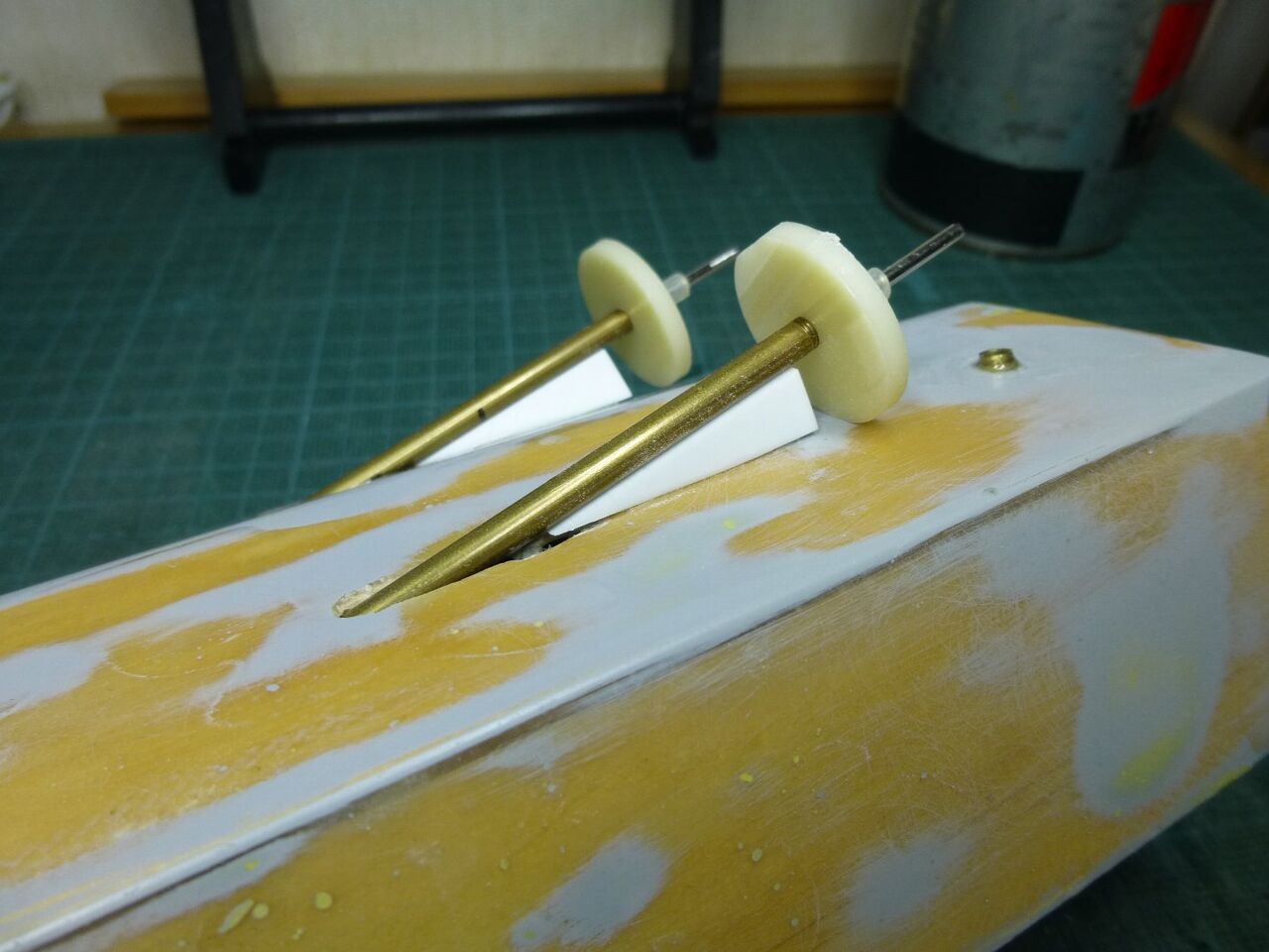 船体への取り付けです。 ユニバーサルジョイントを使うといっても軸は一直線にした方が良いのでまずは内径2mm真ちゅうパイプをジョイトの代わりにして設置します。