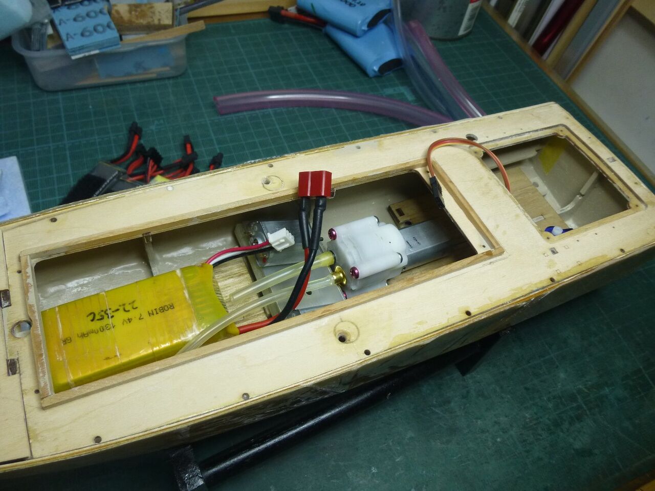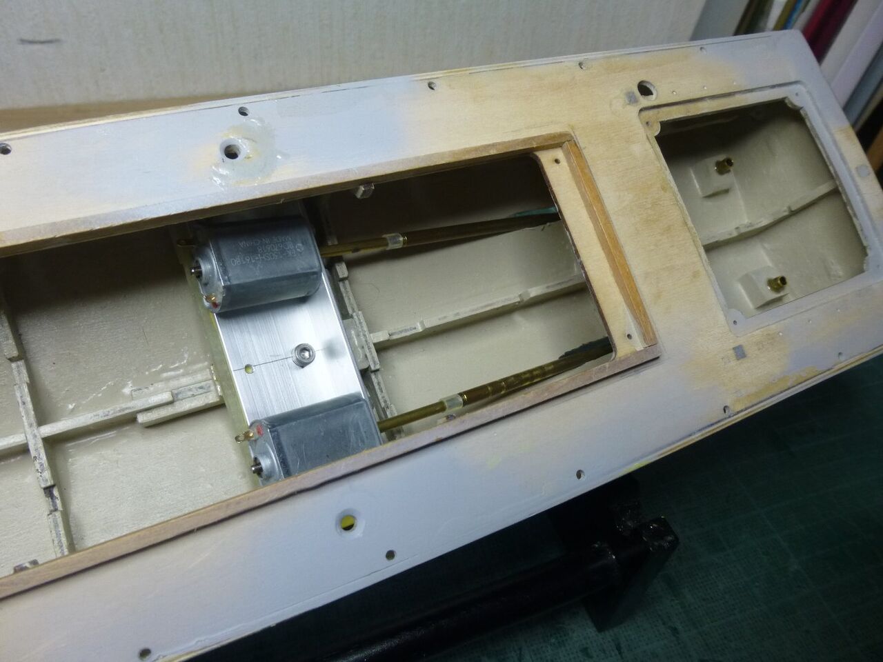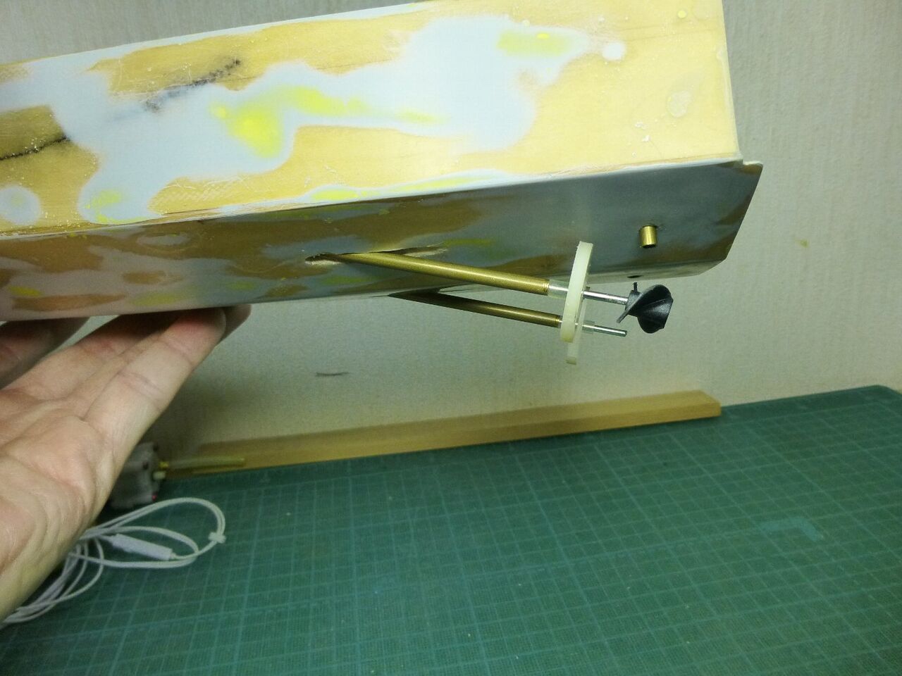 船体への取り付けです。 ユニバーサルジョイントを使うといっても軸は一直線にした方が良いのでまずは内径2mm
