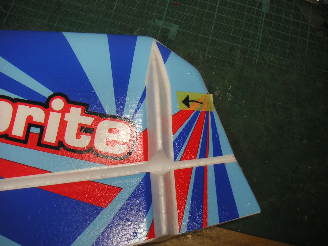 重心位置ですが取説が無いため、まったく分からず不安でしたが、とりあえずバッテリーは3S1800mAhを載せて特にオモリを足すこともせず、写真の黒印の位置で飛ばしてみました。結果としては飛ばしてみて特に問題無しでした。