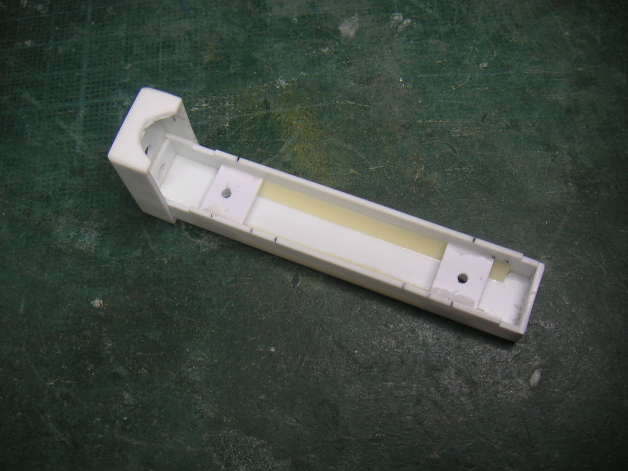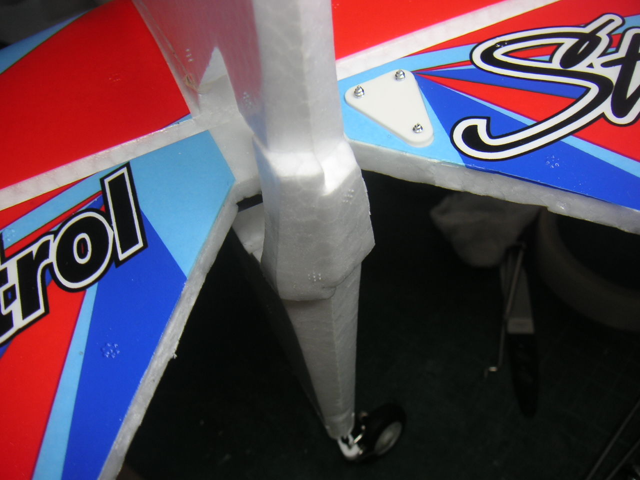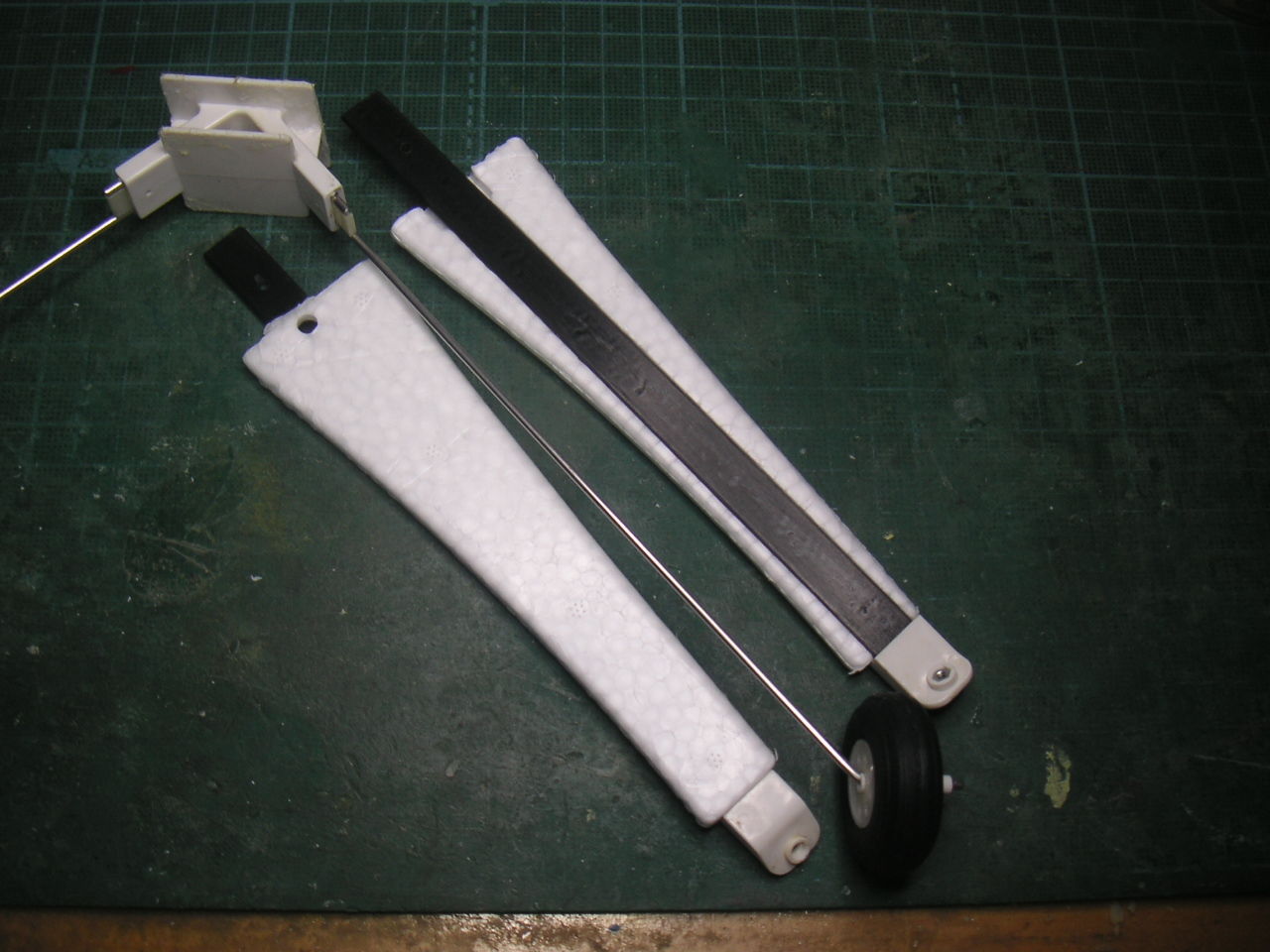続いて足回りです。 Sky Spriteの標準では10×2mmのカーボン板が脚になっています。よって脚の合成はバッチリъ(`ー゜) でもこの剛性が着陸で悪さをするとは・・・(ノ_-;)ハア… 初フライトの着陸の際にちょっとフレアをかけすぎてちょっと失速 ドスンと縦に角度がついて降りてしまいました。その時は破損するはずが無いと思うぐらいの衝撃でしたので気が付かなかったのですが、後で見たら脚の根元から台座ごとバックリと割れてしまいました。