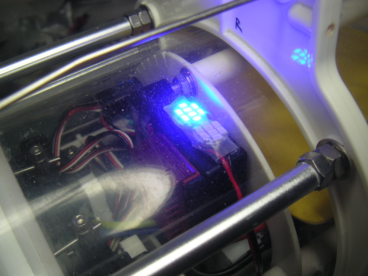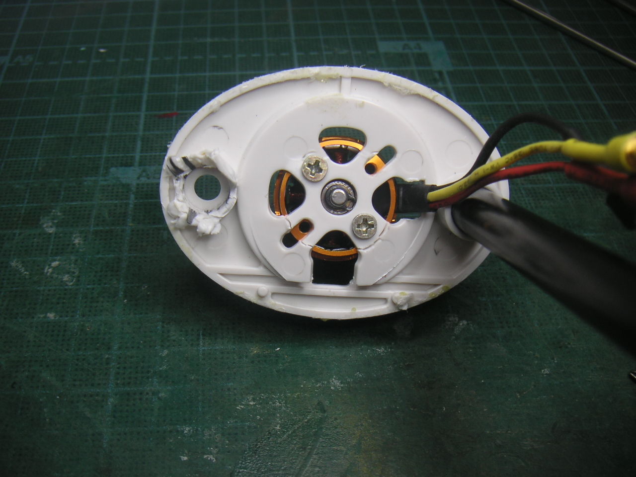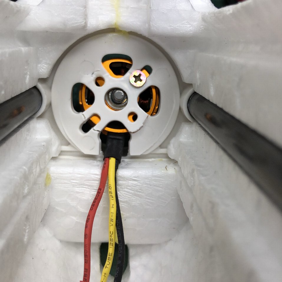 Sky Spriteの標準搭載ではモーターの電線が真下にくるレイアウトです。 この穴にFSDのコードを通して載せてみると・・・ (|||ノ`□´)ノオオオォォォー!! 軸がズレてる モーターの固定ビス穴はピッチが2種類あってどうやらこの向きではFSDは載せられません。コードの位置が90度ずれています。