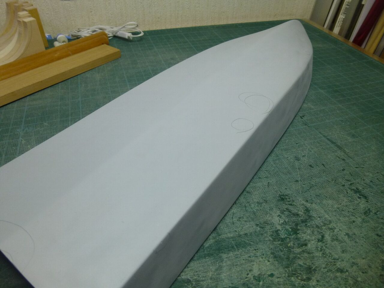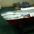 船体外側はこんな感じです。スクリューの外径相当の円盤が船体と干渉せず左右のスクリュー軸の間隔が合う位置が出るようにゴリゴリと船体を削ります。