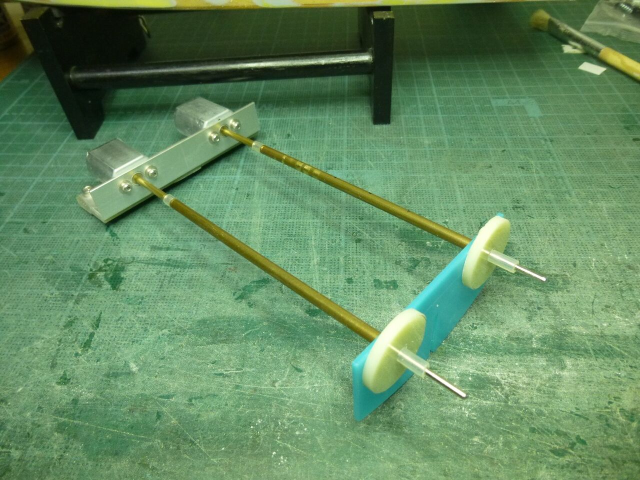 スタンチューブを合わせるとこんな感じです。 これならモーターマウントの2軸とスクリュー側の間隔が同じに平行にセットが出来るので必然とモーターとスクリューシャフト軸は横方向のズレは無くなります。 あとは上下方向だけを注意すれば一直線の心出しが出来るようになります。