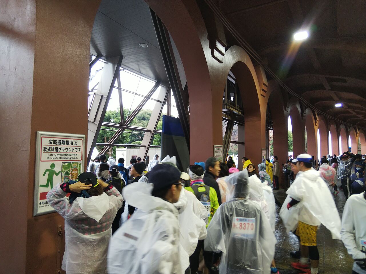 球場の陰でしばらく雨宿、雨除けのビニールを着ている人が多いです
