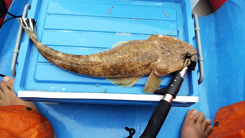 浅場でアンカリングして餌釣りをしているNEKOさんが、良型のカワハギを