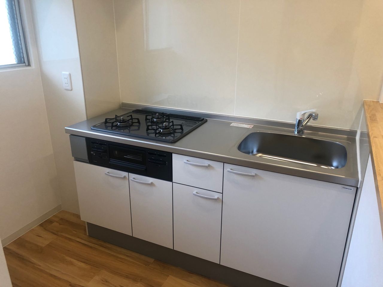 キッチンも大きくて2口コンロ・・・見せる収納でオシャレ感たっぷり