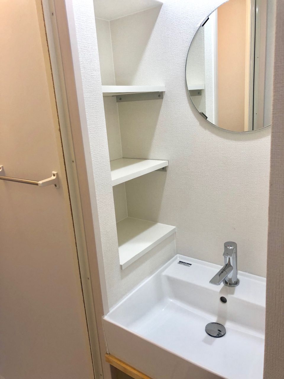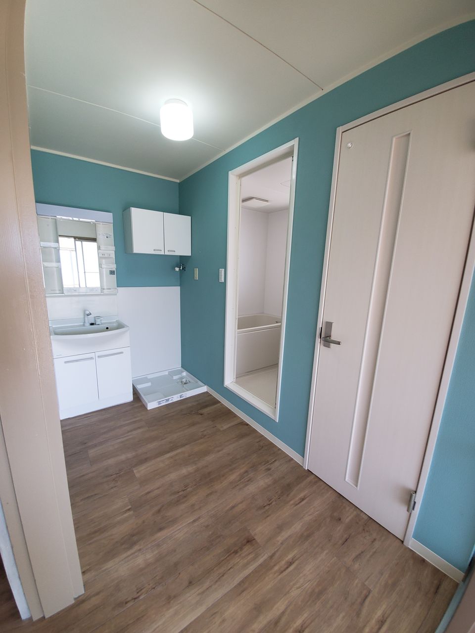 入居者様ご依頼のアクセントカラークロスの洗面所