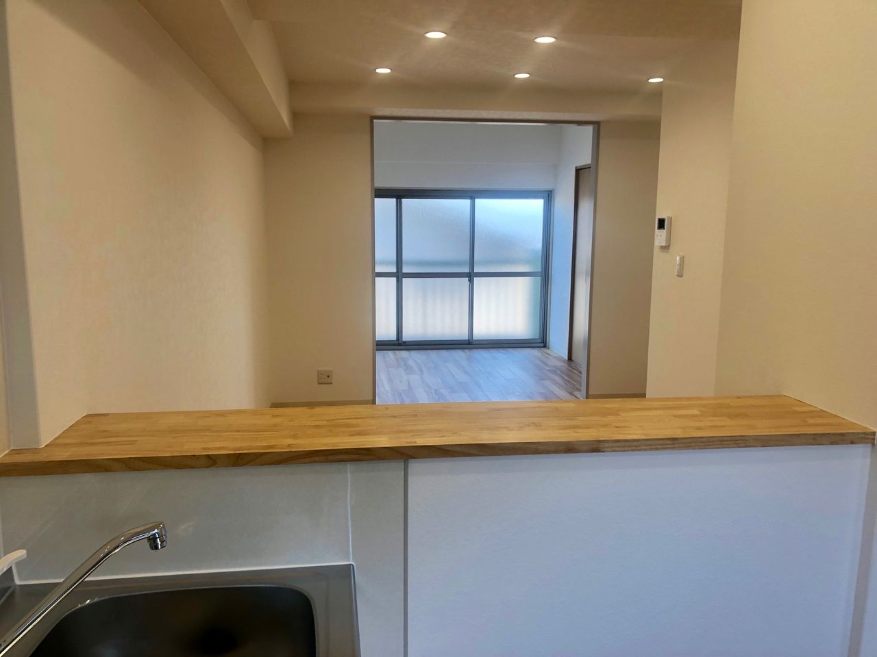 キッチン側から部屋を見た所・・・ダウンライトが映えます