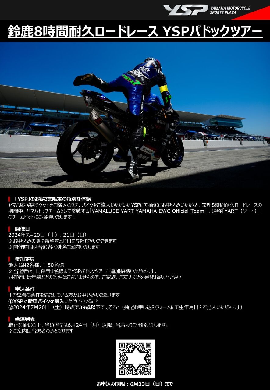 なおYSPでバイクを購入していただいたお客様には、YSPパドックツアー抽選などもご用意しておりますので、よろしくお願いいたします。