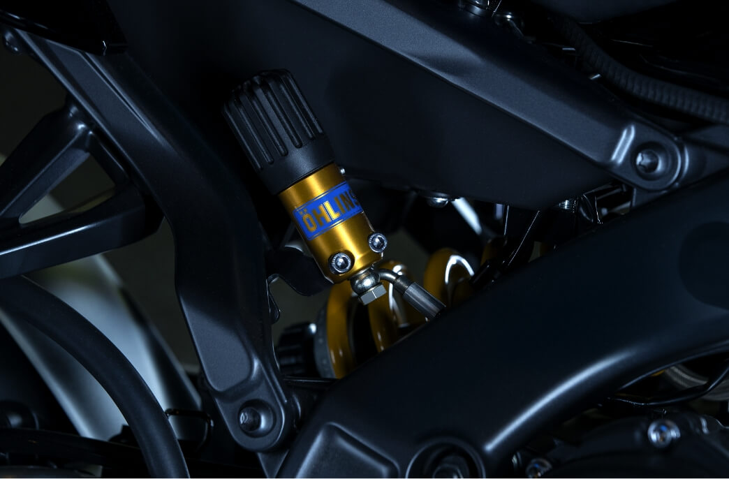 オーリンズ製リアショックは別体タンクにプリロードのリモートアジャスターを搭載。伸び圧減衰は工具不要で調節が可能です。