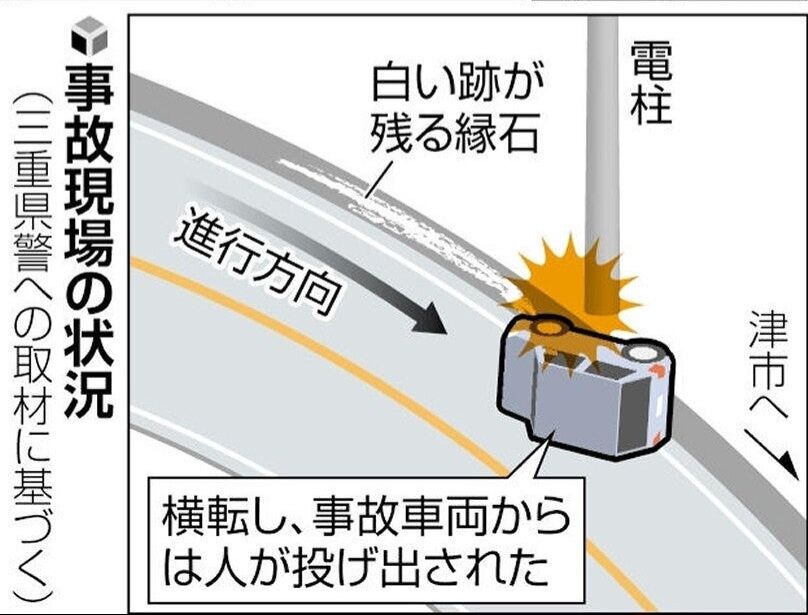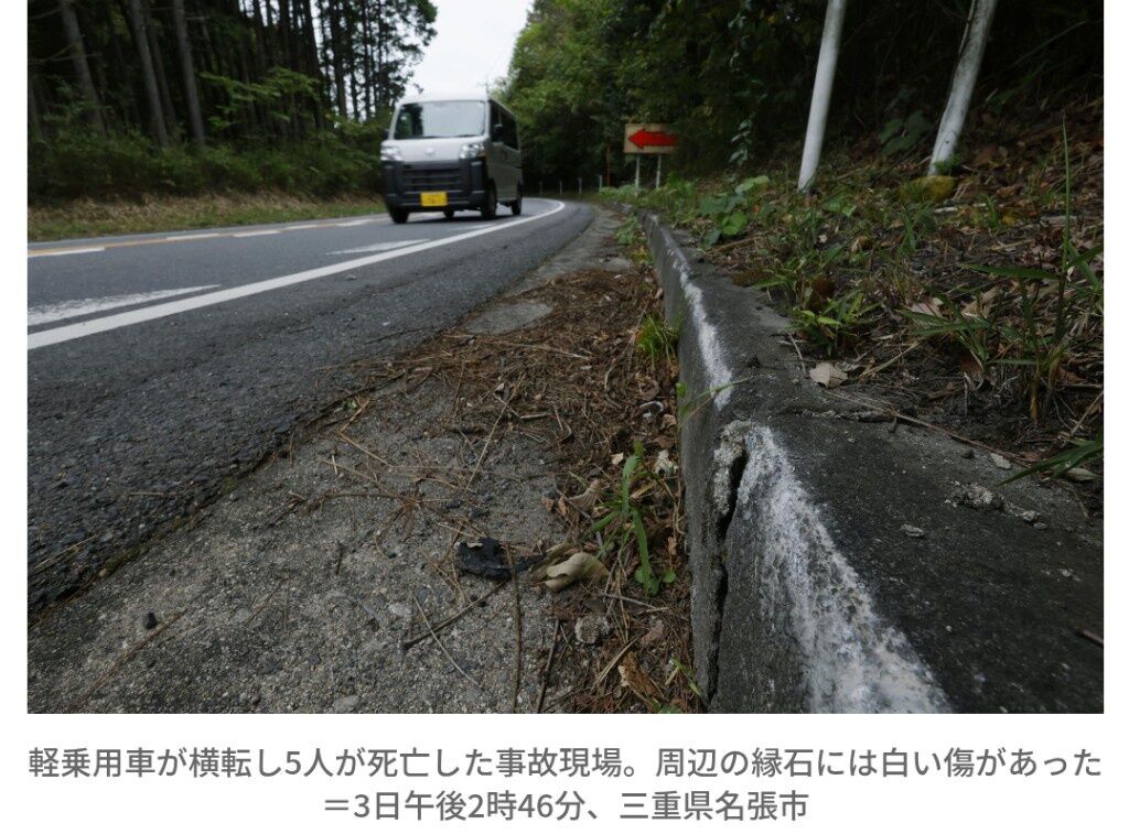 三重県名張市の国道で軽乗用車が横転し男女5人が死亡した事故で、車は事故直前に制限速度50キロを大幅に超えて走行していたことが9日、関係者などへの取材で分かった。防犯カメラ映像の調査から100キロを超えていたとみられ、高速のまま現場のカーブに差しかかり、曲がりきれなかった疑いがある。事故発生から10日で1週間。県警は、運転手の特定や飲酒の有無などの捜査を進める一方、事故防止へ取り締まりを強化している。