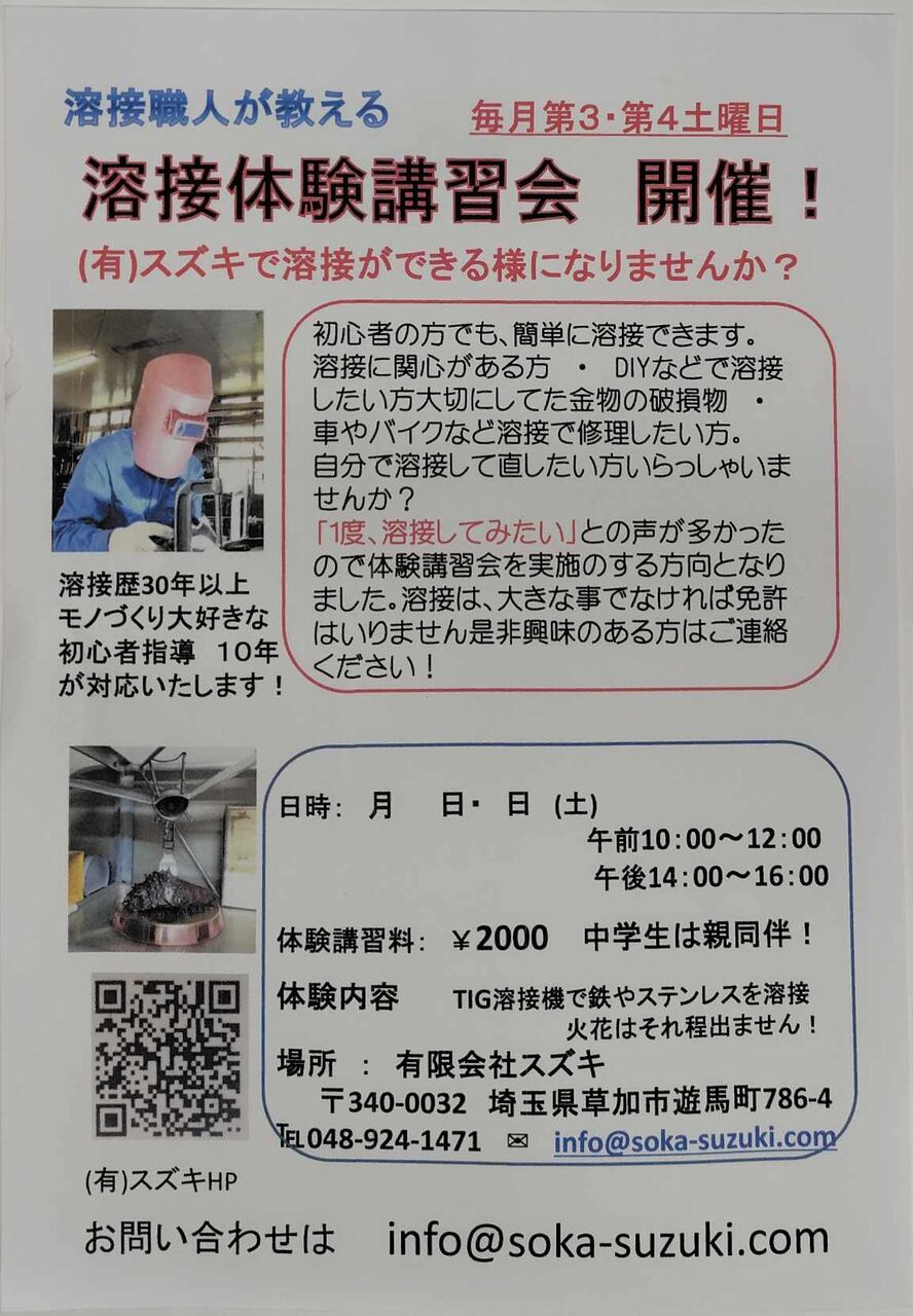 2025年02月16日 溶接体験会! ~毎月第三・第四土曜日に決定~(拡散希望) 2025年2月以降の体験会パンフレット出来ました。 2024年12月から始めてます。1年2か月 役30人以上の一般の方 4人の中学生に体験して頂いてます。みなさん「楽しかったー」って言って頂いてます。 そろそろ暖かくなります。 興味のある方は是非ここのDMや会社のHPへhttp://soka-suzuki.comにメール下さい