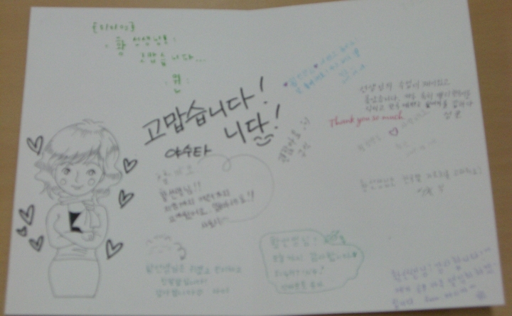 1ヶ月と少しだけのお付き合いでしたが、先生にお世話になったということで、何かプレゼントしようと思ったら、クラスの女の子が、ビデオレターをプレゼントしようってことで、みんなで「先生ありがとう」的なことを韓国語で言っているものをプレゼントしました