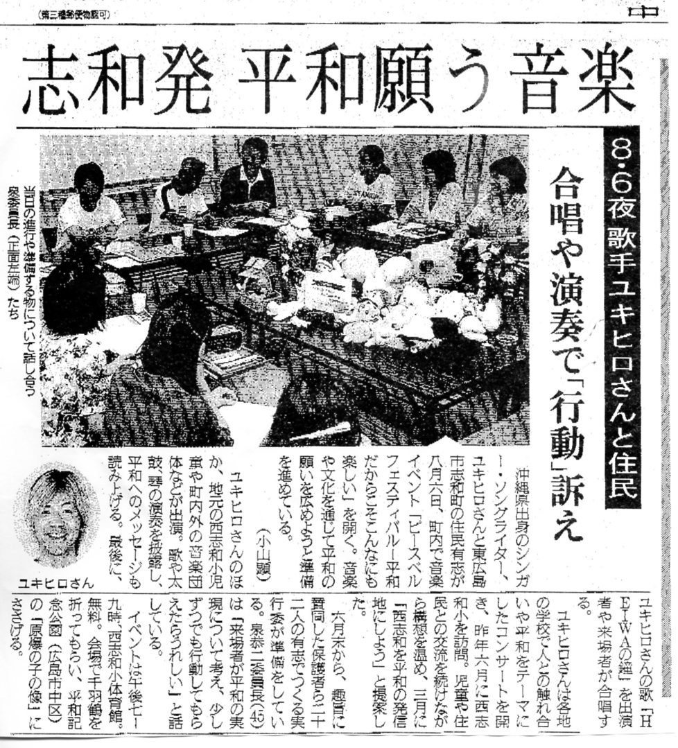 東広島市志和町の住民有志による「ピースベルフェスティバル」実行委員会の模様です。西志和の有志に心から感謝です。ボクも西志和を自分の故郷として平和発信を奏でていきます。フェスティバルをとおして「やればできる」を子供達に証明し、平和の心を育み、みんなで新たな歴史を創っていきたいと思います。全国の皆さんのご声援をよろしくお願いします。