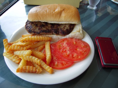 この大きさすごいでしょ!!!アメリカンに自分でトマトとタマネギをパンに挟み、ケチャップとマスタードを好みの量でかけて食べるのだ。