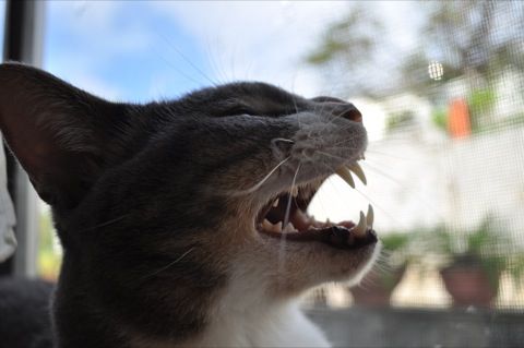 ガッーオ!これでもあくびです(笑)鋭い牙は、ハンターの証ですね。よくヤモリをとってます。ヤモリにこの牙はいらんだろ(笑)Gooちゃん。