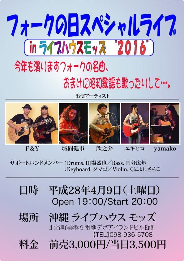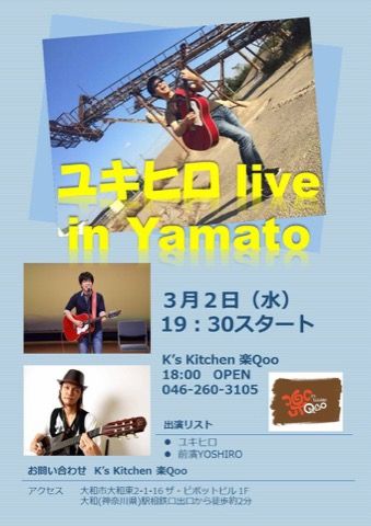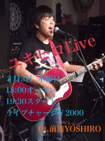 気候の変化が激しい季節ですね。体調を崩さないように元気に過ごしてね!さて、春はユキヒロLIVEから(笑)元気発信音楽・ユキヒロ 3月LIVEのお知らせです。ぜひ遊びに来てね!!