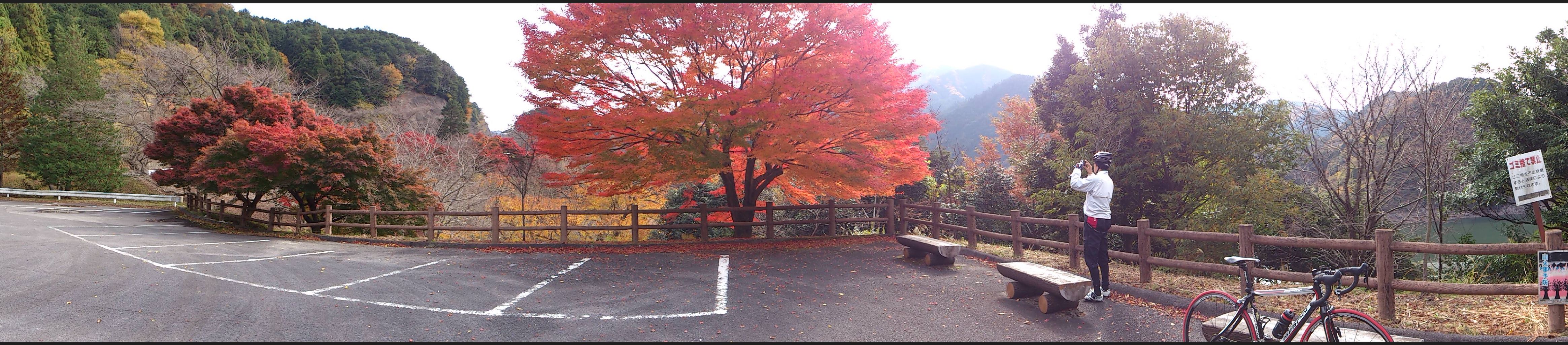 火の谷温泉のあたりまで下った後、君ヶ野ダムへ登ってきました。この湖畔も紅葉真っ盛り。ここでおにぎりで補給休憩。ここで一気に食べてしまうと、その後いくつもある峠でスタミナ切れになるので、1個にしておきました。
