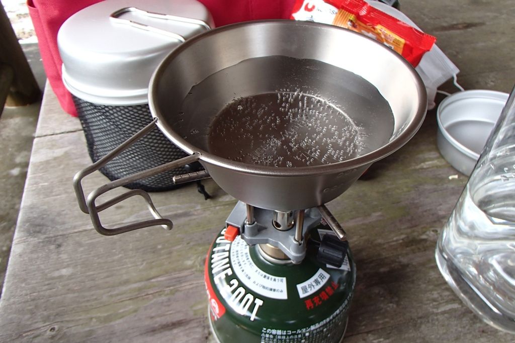 さてお次は暖かいコーヒー。お湯を沸かします。面倒くさいのでシェラカップのみ。ここへ顆粒状のキャラメルマキアートを入れてひたすらかき混ぜます。