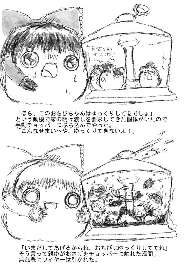 2026年02月06日 【合体あき】節分と赤いまめ 2026年02月04日 【作者不明】花も恥じらう美ゆんれいみゅ 2026年02月02日 【合体あき】合体あきの単品絵と短編集【2/2更新】 2026年02月02日 【作者不明】死ねない苦しみ ほか単品絵と短編集【2/2更新】 2026年01月30日 【合体あき】毎朝☆アマギリ情報室!【1/28追加】 2026年01月25日 【作者不明】ゆっくり雪まんじゅう 2026年01月21日 【わさキラーあき】 越冬 【ゆん森投稿作品】 2026年01月20日 【合体あき】おへやをあげるよ! 2026年01月18日 【なきわさあき】泣きれいみゅ(1/18更新)【ゆん森投稿作品】 2026年01月18日 【合体あき】ずっといっしょれいむ! 2026年01月17日 【合体あき】しょくしゅぺにぺに 2026年01月16日 【作者不明】ゆっくり擬似不死身化首吊り漫画 2026年01月15日 【作者不明】れいみゅとお花漫画 2026年01月12日 【合体あき】ゆっくりファイターズ! 2026年01月09日 【合体あき】しんめとりーっ! 2026年01月05日 【合体あき】なぜゆっくりは惨たらしく死ぬのか 2025年12月30日 【キリライターあき】まりちゃの年越し【年末恒例】 2025年12月26日 【焼印あき】焼印あきの単品絵と短編集【12/26更新】 2025年12月24日 【としあき(はがいたい)】一夜だけのサンタまりちゃ【クリスマス特集】 2025年12月22日 【野良あき】野良あきの単品絵と短編集 14【12/22更新】 2025年12月04日 【作者不明】ぽかぽかさん 2025年12月04日 【作者不明】街ゆにとってネズミは狼並みに恐ろしい 2025年11月28日 【作者不明】るーるいはん【ゆん森投稿作品】 2025年10月04日 【早苗総理誕生記念】さなえが主役のゆっくり虐待作品5選【一年ぶり再掲】 2025年09月21日 【れみりゃあき】街ゆギルド 2025年09月16日 【焼印あき】おさげちぱちぱ♡まーた 2025年08月30日 【としあき(ぺいんと)】小学生の夏休みの宿題にありそうな題材 2025年08月29日 【作者不明】自由に文字を入れられる焼印サービス 2025年08月04日 【作者不明】ゆっくりパイのレシピ他【ゆん森オリジナル作品】 2025年07月30日 【としあき(雛)】ひなちゃん特製対野良ゆっくり雛人形 2025年07月30日 【わさキラーあき】わさキラーあきの単品絵と短編集3【ゆん森投稿作品】 2025年07月22日 【作者不明】ビリビリに破いてあげたくて ほか単品絵と短編集【7/22更新】 2025年07月19日 夏休みに読みたい!夏がテーマのおすすめゆっくり虐待7選【再掲】 2025年07月13日 【ふたばまとめ】ゆっくりの墓荒らし 2025年07月06日 【作者不明】ゆっくりのおうち作りって 2025年06月30日 【作者不明】ゆっほゆっほつたえなきゃ ほか【6/29更新】 2025年06月14日 【作者不明】せきゃいいちきゃわいいれいみゅ【再掲】 2025年06月14日 【和菓子あき】ひとゆっこについて【再掲】 2025年06月14日 【作者不明】としあき(水彩)の単品絵と短編集【再掲】 2025年06月12日 【かに星雲あき】すずなまりさの金バッジさん【再掲】 2025年05月19日 【ちぇんあき】はしるゆっくりおちぇん他GIF作品集【ゆん森投稿作品 5/19更新】 2025年05月19日 【作者不明】ミニゆっくりウム 2025年05月19日 【作者不明】えーあいせいせいゆっくり【5/18更新】 2025年04月19日 【としあき(つむり)】デビュー阻止 2025年04月05日 【としあき(ほのぼの)】めいたんていまりさ 2025年03月24日 【としあき(ほのぼの)】としあき(ほのぼの)の単品絵と短編集 2【3/24更新】 2025年03月23日 【としあき(つむり)】おうちの壁を壁ゆ仕様にしたよ! 12345...23»