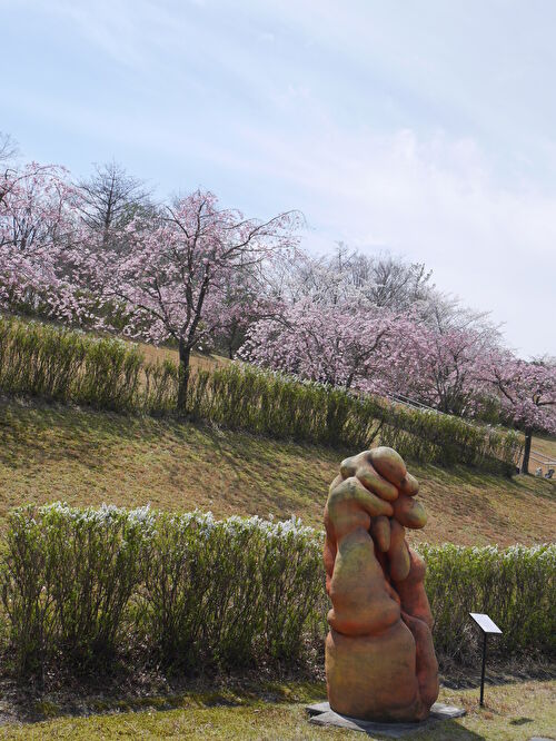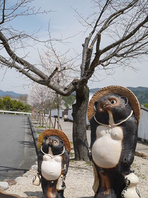 たぬきの向こうには、桜が咲き始めていました