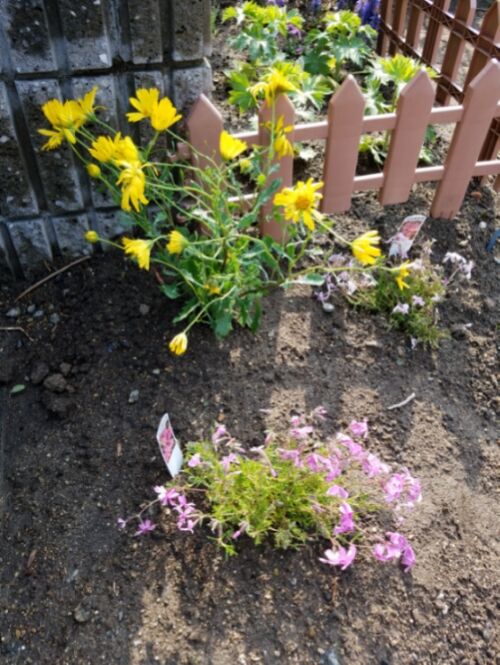 姑の花壇の一部を整地して花を植えました
