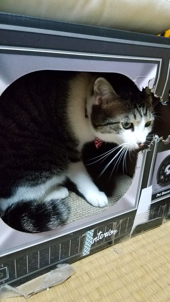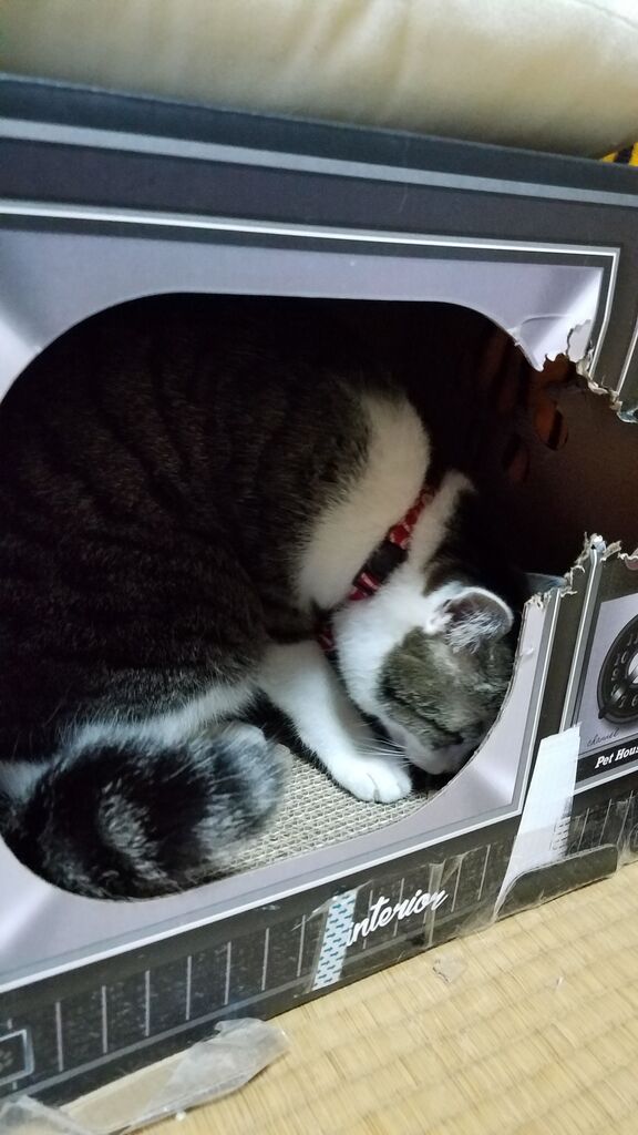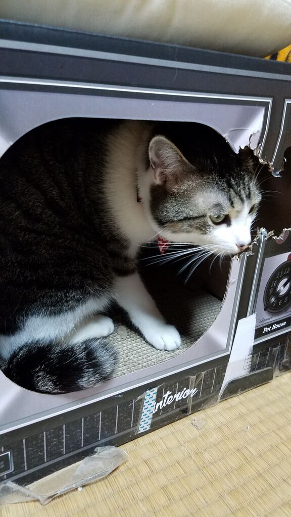 テレビ型爪とぎの中にはいって齧ってる琥珀