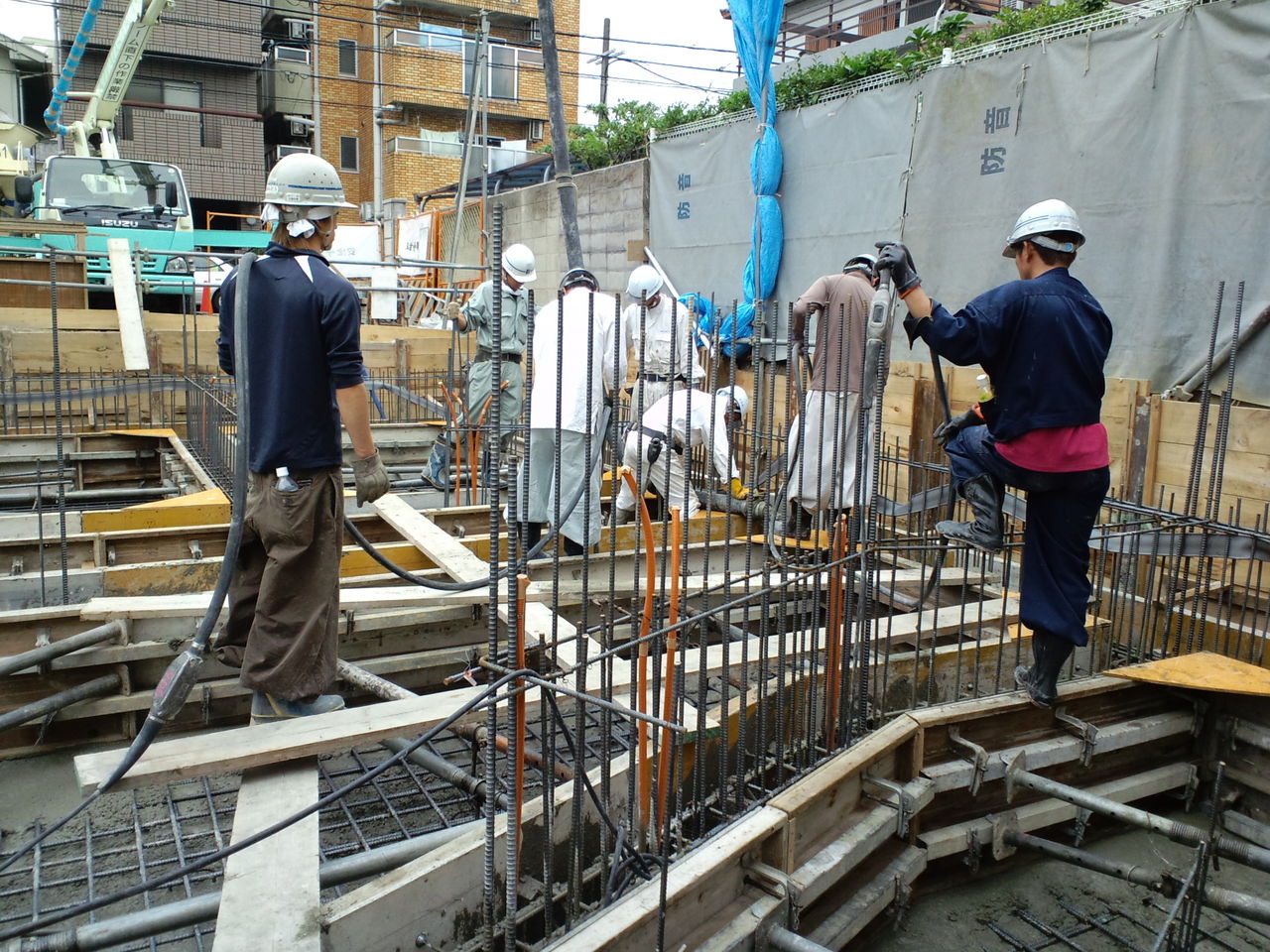 この建物は躯体防水工法を採用しています。水セメント比の小さい硬めのコンクリートにコンプラストを混入し水密性の高い躯体を打ちます。壁式構造で比較的鉄筋量の多い壁に硬いコンクリートを打つのは困難です。大勢が掛りきりで慎重に施工。