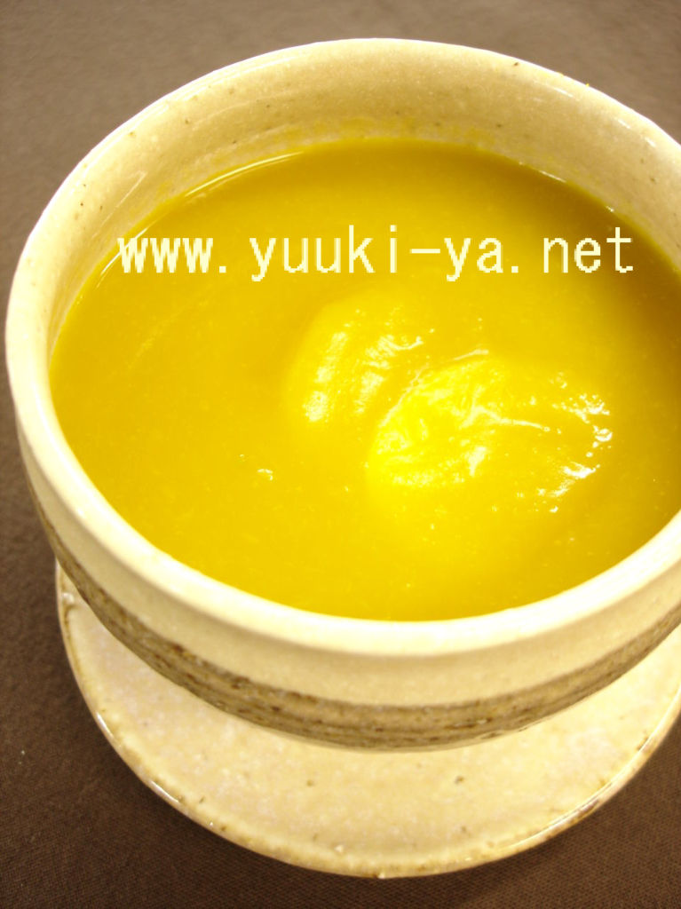 2、1のかぼちゃを鍋に入れて、水を加えてゆでます。かぼちゃが柔らかくなったら、ゆで汁ごとミキサーにかけます。
