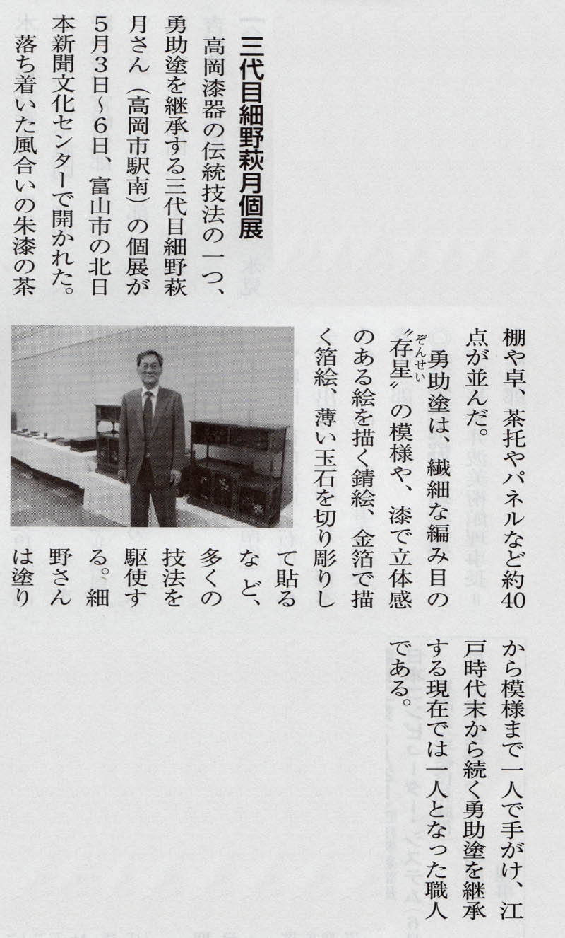 このたび富山県人社より発刊されている「富山県人」において、先月開催させていただきました細野萩月個展の様子をご紹介いただきました。