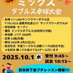 皆様こんにちは☀️10月1日(水)開催の「Y.Y LINKミックスダブルスカップ」にお越しいただきまして誠にありがとうございました!!11組(22名)のご参加をいただきました!!✨予選リーグより熱い試合が繰り広げられました🔥💪笑顔が多く見られる試合となり、またの開催を望む声 ...