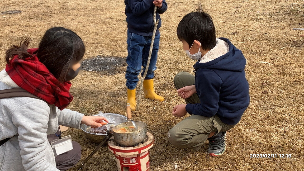 私は今回七輪で「だご汁」を作るというプログラムを担当しました。だご汁は「だんご汁」で基本は小麦粉の団子なのですが、火の通りを良くするため薄く延ばして鍋に入れます。もちろん、野菜や味噌、出汁も準備しました。自然観察や火起こしの間に白菜、ダイコン、人参、里芋、アゲなどを切り、13家族に分けました。この準備がなかなか大変でした。そして会場に運び鍋や水、箸とお玉なども準備します。参加者はまずたき火をして火を起こし、七輪に用意するまでが大変です。その後だご汁の説明を短時間でして、とにかく湯を沸かし、野菜と団子を煮込みます。味噌と出汁を入れて柔らかくなったら完成です。早い家族で10分くらいで食べられるようになりました。白菜や里芋がまだ半生状態でもかえってシャキシャキしてとても美味しくいただけました。私も真っ先にできた鍋からご相伴いただき、「うまいっ!」と歓声を上げるとみんな俄然やる気が増したようです。「めっちゃうまい」「最高だ」寒い冬なのでとにかくお汁が美味しいのです。正直今までで一番美味しい味噌汁だと思った人がほとんどだったでしょうね。「どんな味噌や出汁ですか」と聞かれましたが、「普通のお味噌とシマヤです」と答えたら驚かれました。外で食べること、みんなで食べること、寒い冬に食べること、すべて環境が整って「最高に美味い」だご汁ができたようです。野菜が多すぎて鍋に入らなかったら回収して持ち帰ろう…などと思っていましたが、どの家族も完食。2回目を煮るところも多くありました。