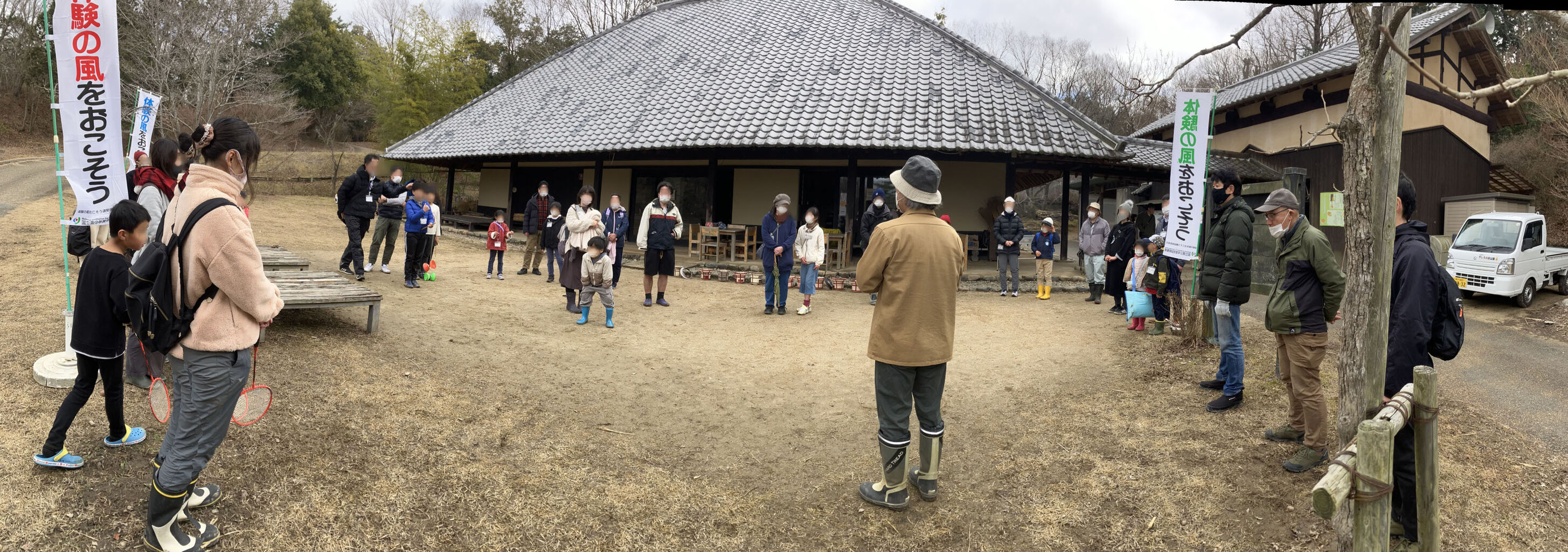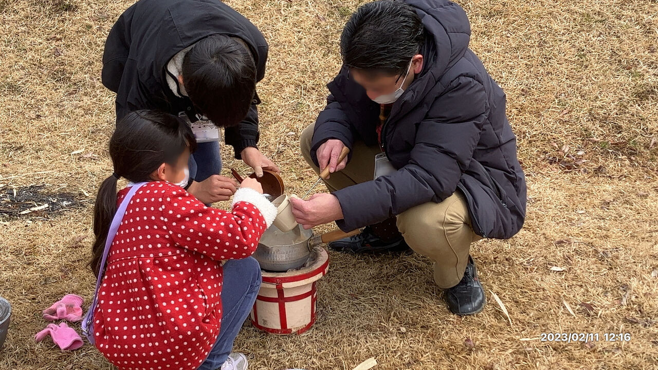 年に4回、社の森公園で「四季を感じる原体験」を行っています。原体験の代表I氏が運営するこのイベントを前年の秋から子どもゆめ基金を使って開催しています。今回は13家族で40人ほどの参加がありました。今まで私が参加した中で一番多く来られました。冬の原体験は火を使います。たき火や七輪を体験し、その上でクッキングもします。「火」というものに触れたことの無い子も多いようです。親世代もマッチで点火できない方も増えてきました。ここに参加されるような方はその意識もあるでしょうね。子どもたちに危ないけどうまく利用すると有用な火を体験させることで大きな危険を回避できるという考えです。