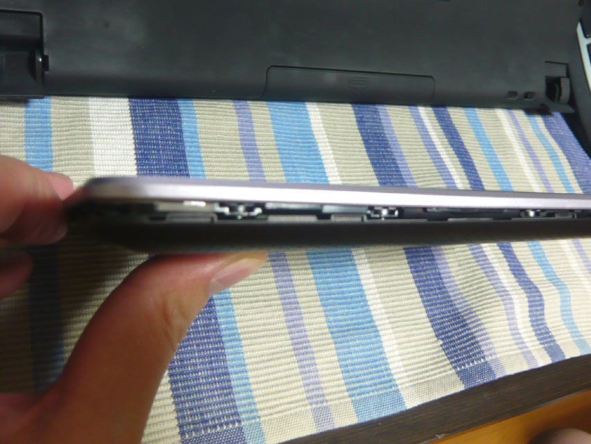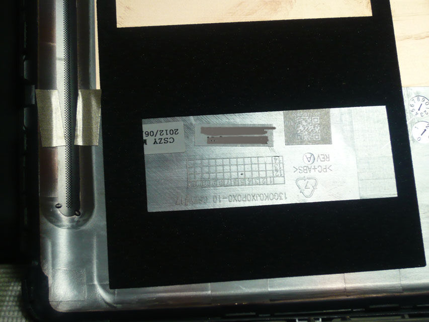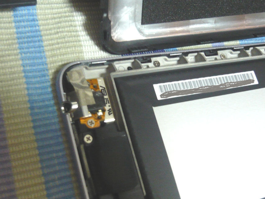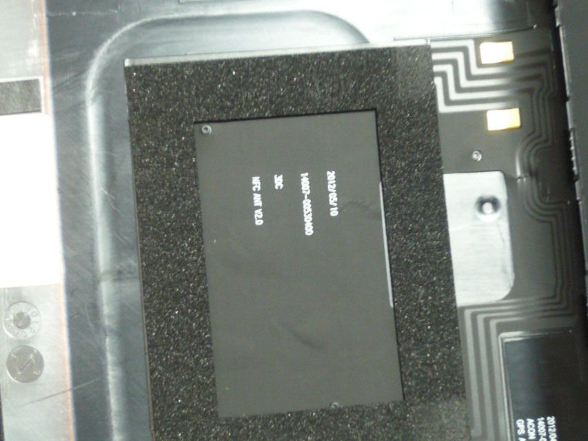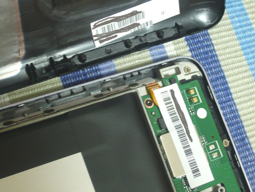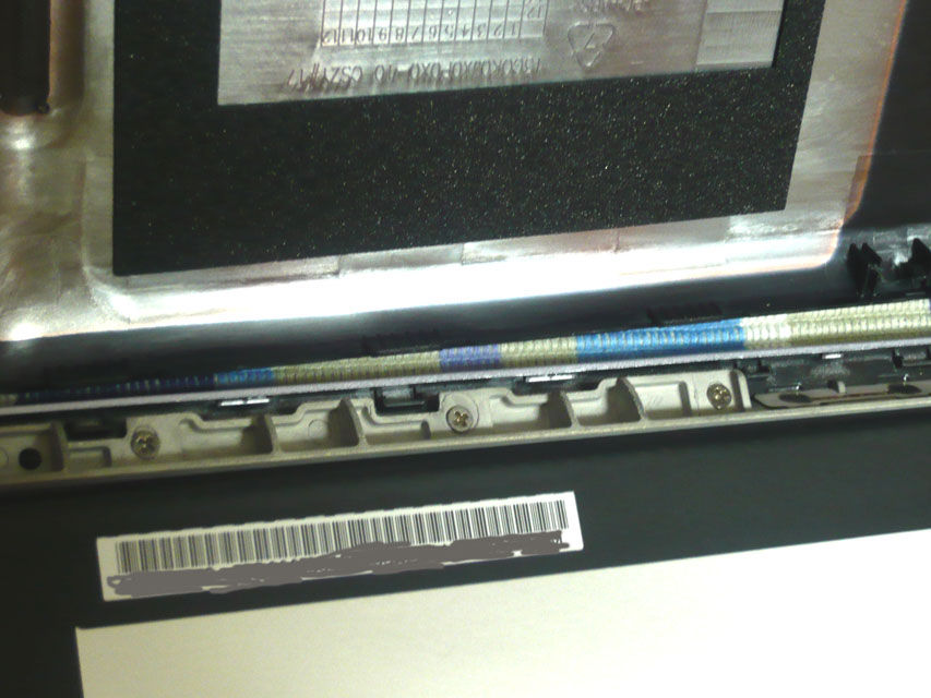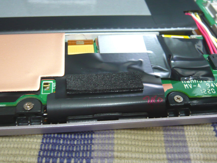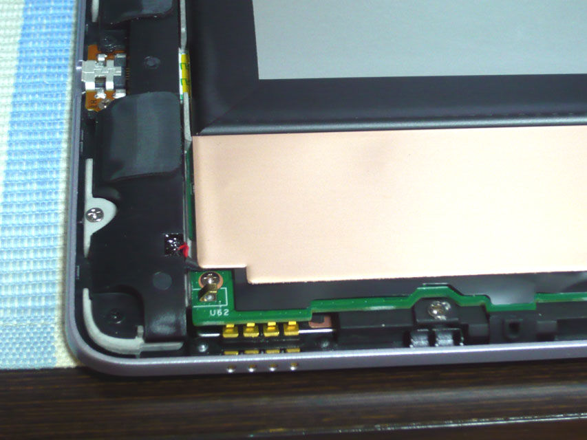 ちょうどガラスの浮きが発生する箇所の裏側に、ディスプレイかタッチパネルのフラットケーブルがありますが、ここにスポンジが貼ってあります。