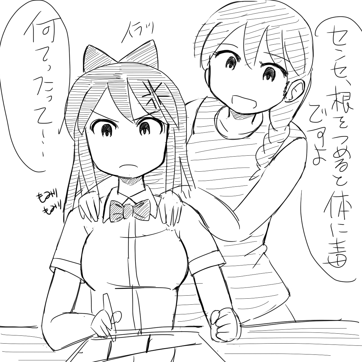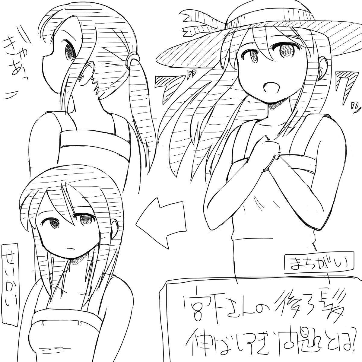 髪を下ろした宮下さんが好きで好きで好きでよくおまんがに描くのですが、ついつい髪を盛り過ぎてしまってばっさばさにしてしまいます。これをまとめたら後頭部に塔がそそり立ってしまいますね。のりお先生のお描きになる通り、首の付け根より少し下までですよね・・・でも・・・物足りない。それはともかくとして宮下さんは1年に3回くらいでいいので是非髪を下ろしてほしい。