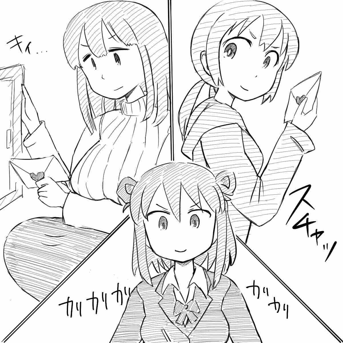 前回に引き続き3年生を送る会です。うみちゃんの劇的なゴンドラ登場からようやく落ち着いて、車座になって座ります。3年生が7人、下級生が5人、美ボ会が2人といったところ。前回頑張ったエロ漫画はひとまず置いておいて、下級生から先輩へのお手紙朗読からスタートです。ロングヘアを真ん中で分けた人からスタートですが、端に座ったちとせが驚愕の表情を浮かべます。